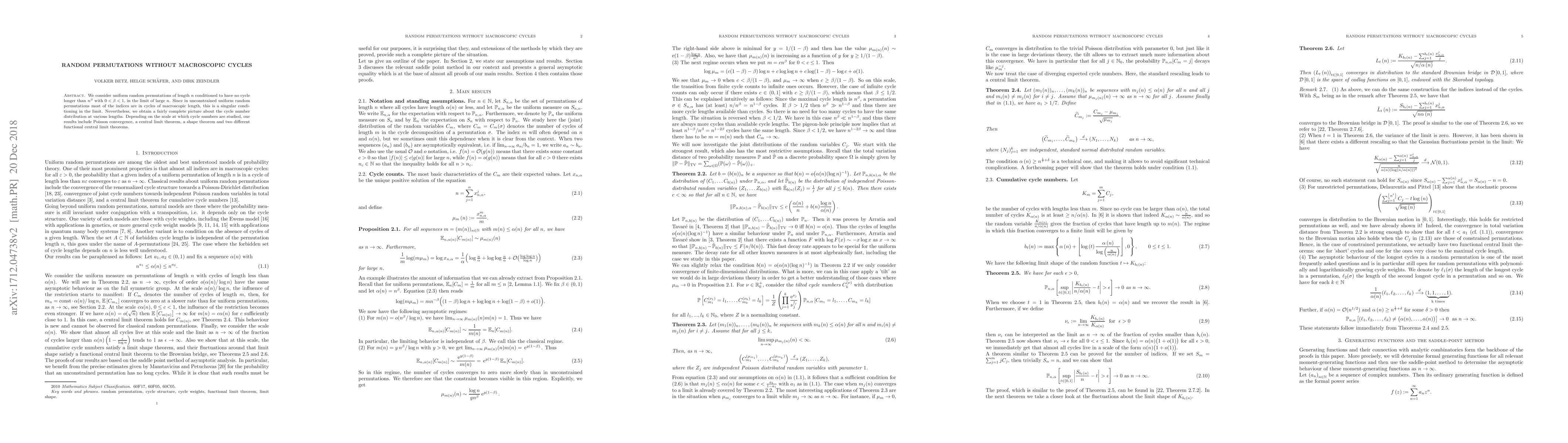 This paper studies uniform random permutations of length $n$ conditioned to exclude cycles longer than $n^\beta$ with $0<\beta<1$, revealing a detailed cycle number distribution, including Poisson convergence, central limit theorems, and shape theorems in the large $n$ limit.