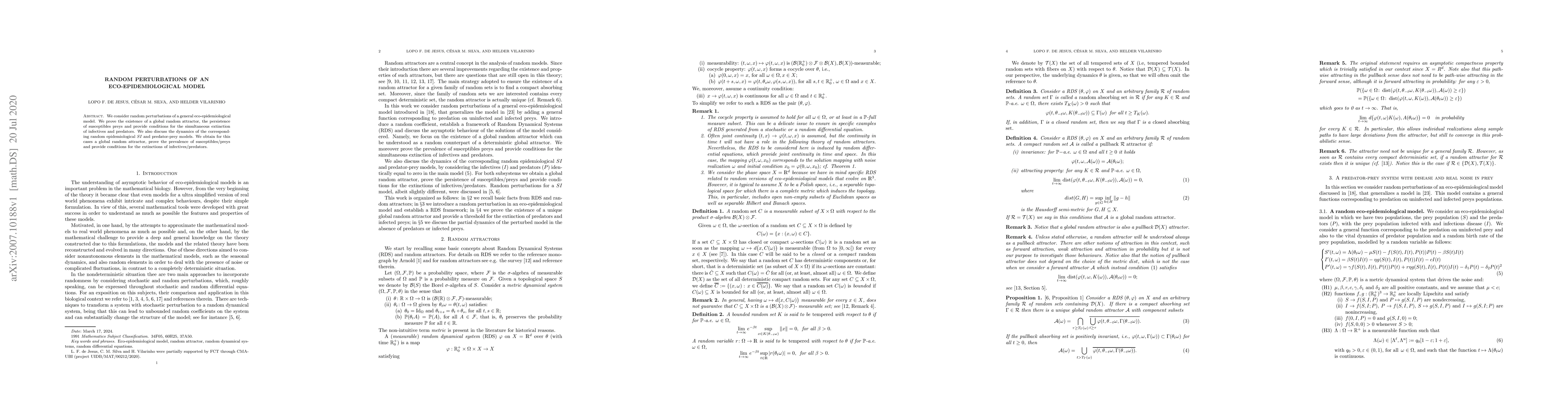 We consider random perturbations of a general eco-epidemiological model. We prove the existence of a global random attractor, the persistence of susceptibles preys and provide conditions for the simultaneous extinction of infectives and predators. We also discuss the dynamics of the corresponding random epidemiological $SI$ and predator-prey models. We obtain for this cases a global random attractor, prove the prevalence of susceptibles/preys and provide conditions for the extinctions of infectives/predators.