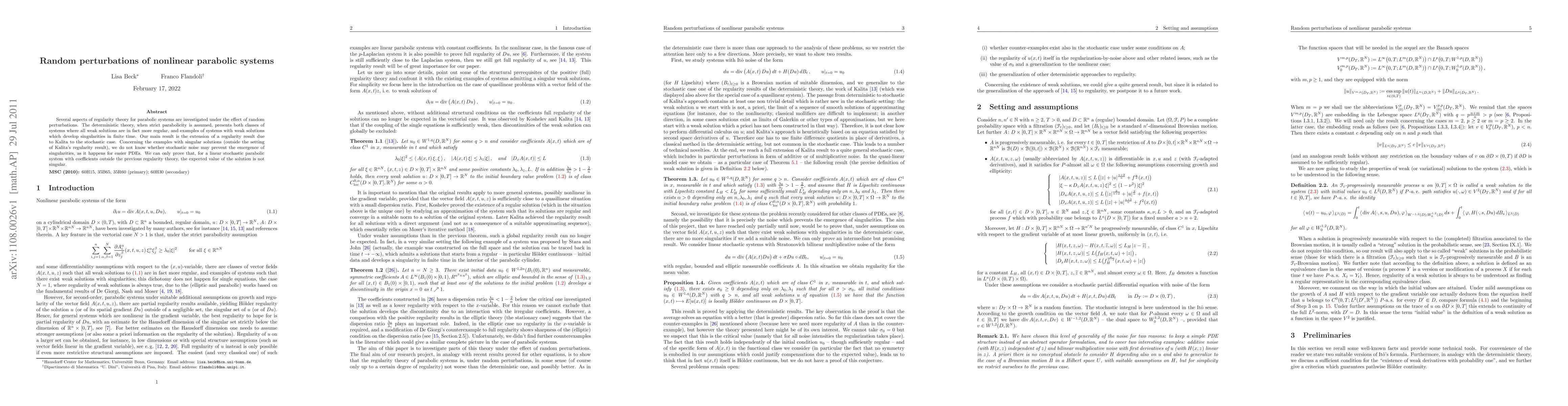 Several aspects of regularity theory for parabolic systems are investigated under the effect of random perturbations. The deterministic theory, when strict parabolicity is assumed, presents both classes of systems where all weak solutions are in fact more regular, and examples of systems with weak solutions which develop singularities in finite time. Our main result is the extension of a regularity result due to Kalita to the stochastic case. Concerning the examples with singular solutions (outside the setting of Kalita's regularity result), we do not know whether stochastic noise may prevent the emergence of singularities, as it happens for easier PDEs. We can only prove that, for a linear stochastic parabolic system with coefficients outside the previous regularity theory, the expected value of the solution is not singular.