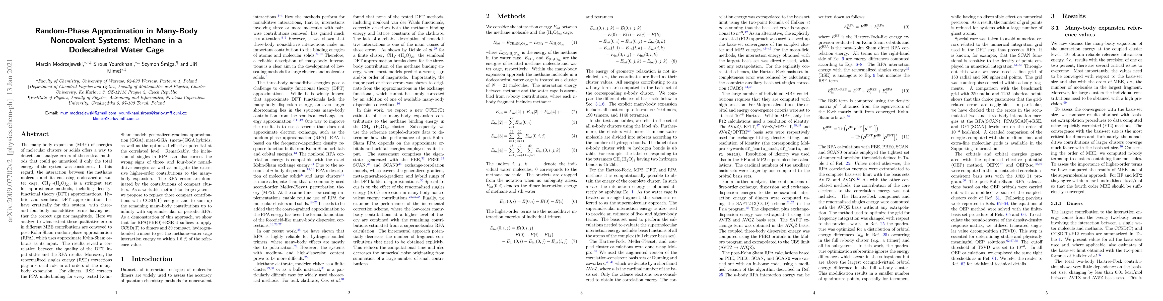 This paper investigates the interaction between methane and a dodecahedral water cage using the random-phase approximation (RPA) and examines how errors in density-functional theory (DFT) propagate into RPA results. The study finds that renormalized singles energy corrections effectively mitigate RPA underbinding and incorrect higher-order nonadditive terms, suggesting a hybrid approach combining RPA with CCSD(T) for compact clusters can accurately model large systems.