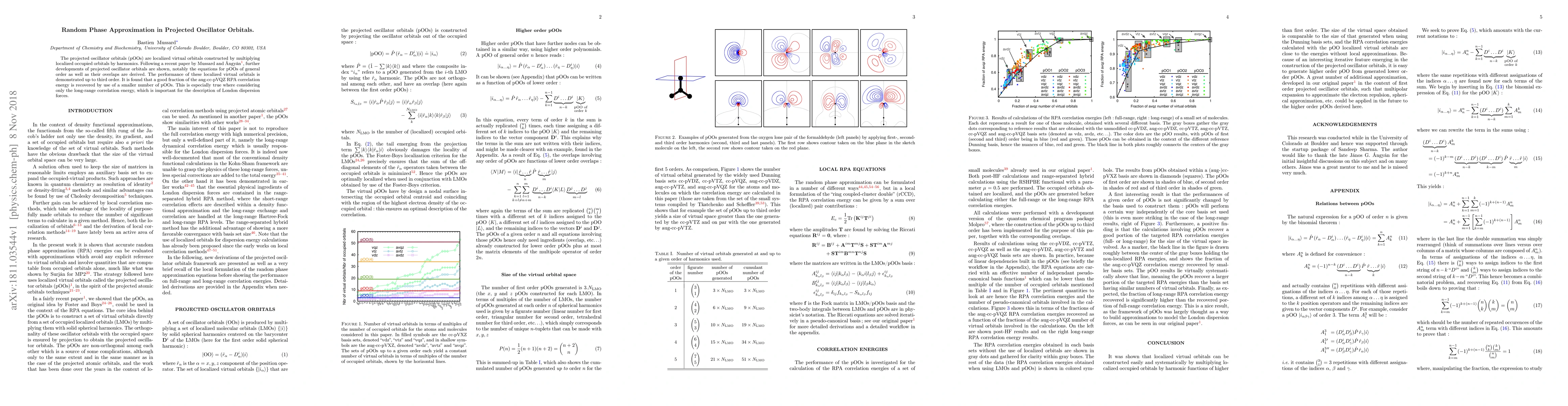 This paper develops projected oscillator orbitals (pOOs) and derives equations for their general order and overlaps. It demonstrates that a smaller number of pOOs can recover a significant portion of the aug-cc-pVQZ RPA correlation energy, particularly for long-range interactions crucial for London dispersion forces.