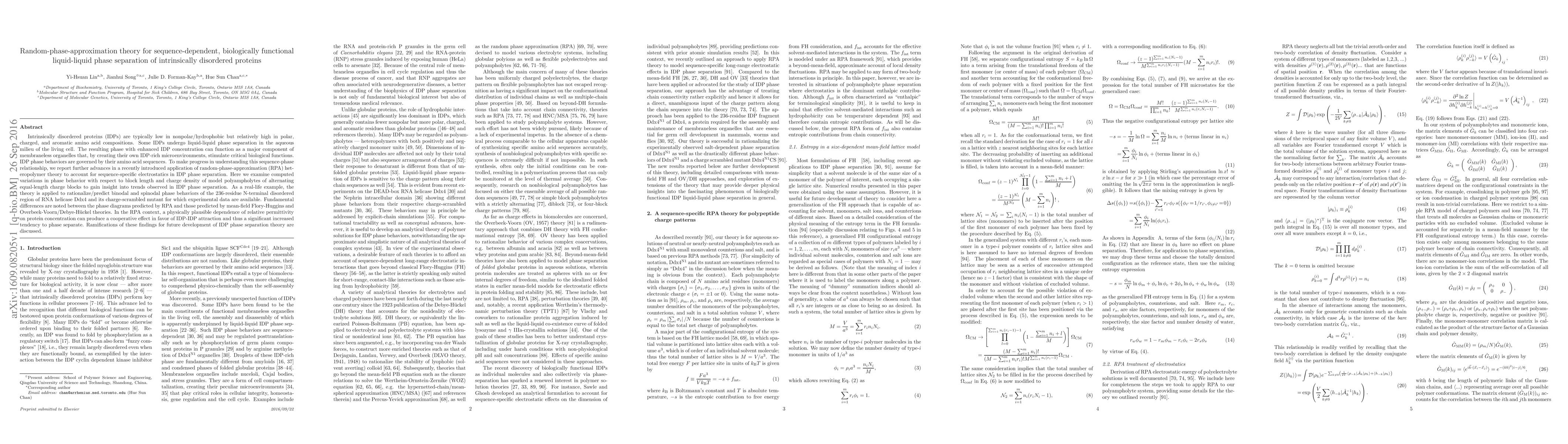 This paper advances the random-phase-approximation (RPA) theory to model the sequence-dependent liquid-liquid phase separation of intrinsically disordered proteins (IDPs). It highlights differences in phase behavior predictions between RPA and traditional theories, emphasizing the role of sequence-specific electrostatics and cooperative effects in IDP phase separation.