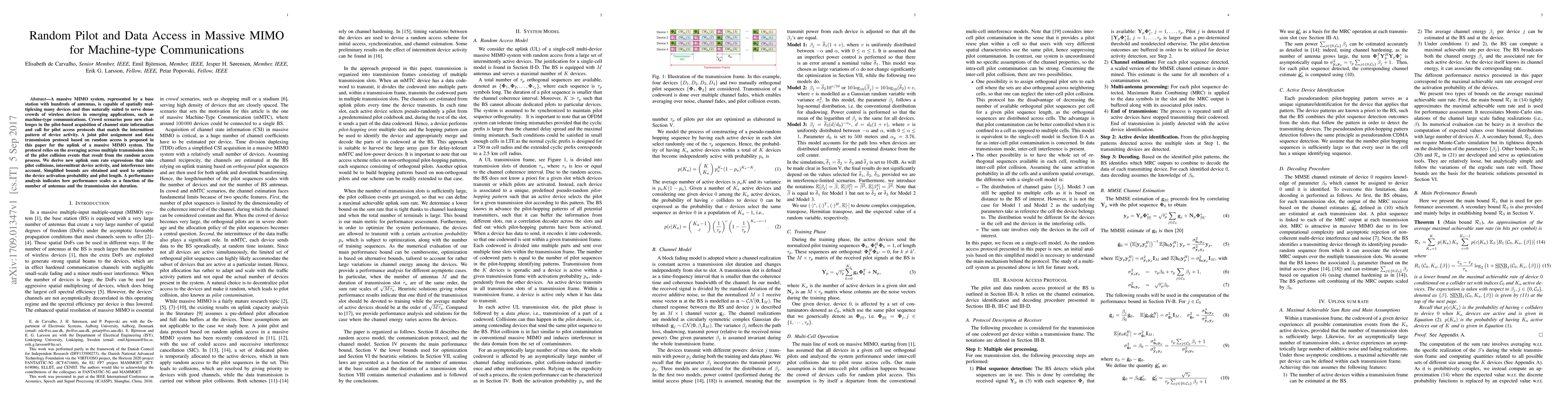 This paper proposes a random access protocol for pilot assignment and data transmission in massive MIMO systems to serve dense machine-type communications. It derives new uplink sum rate expressions considering pilot collisions, device activity patterns, and interference, optimizing device activation probability and pilot length.