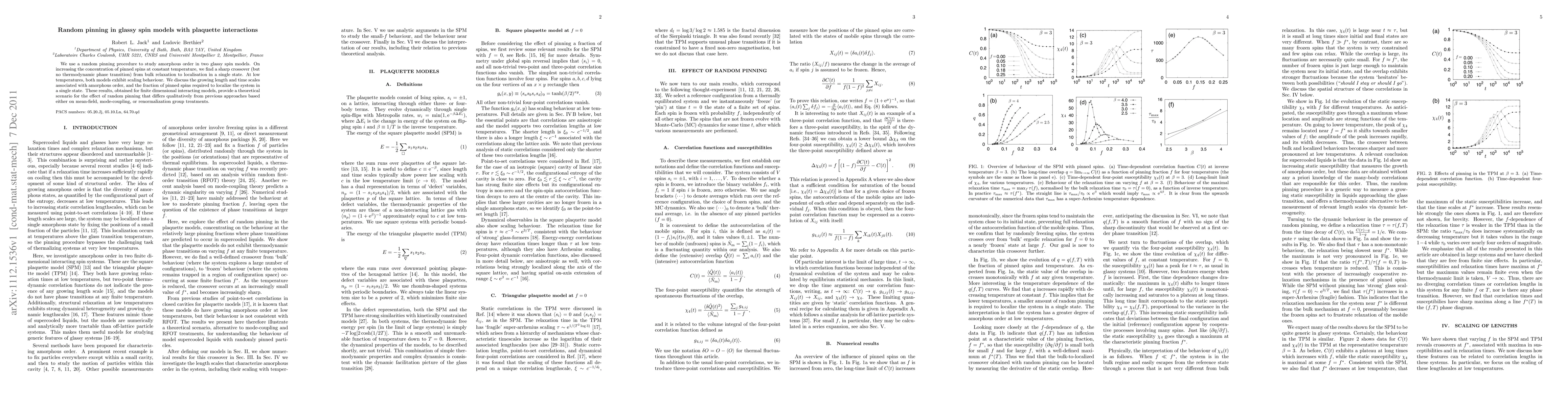 We use a random pinning procedure to study amorphous order in two glassy spin models. On increasing the concentration of pinned spins at constant temperature, we find a sharp crossover (but no thermodynamic phase transition) from bulk relaxation to localisation in a single state. At low temperatures, both models exhibit scaling behaviour. We discuss the growing length and time scales associated with amorphous order, and the fraction of pinned spins required to localize the system in a single state. These results, obtained for finite dimensional interacting models, provide a theoretical scenario for the effect of random pinning that differs qualitatively from previous approaches based either on mean-field, mode-coupling, or renormalization group reatments.