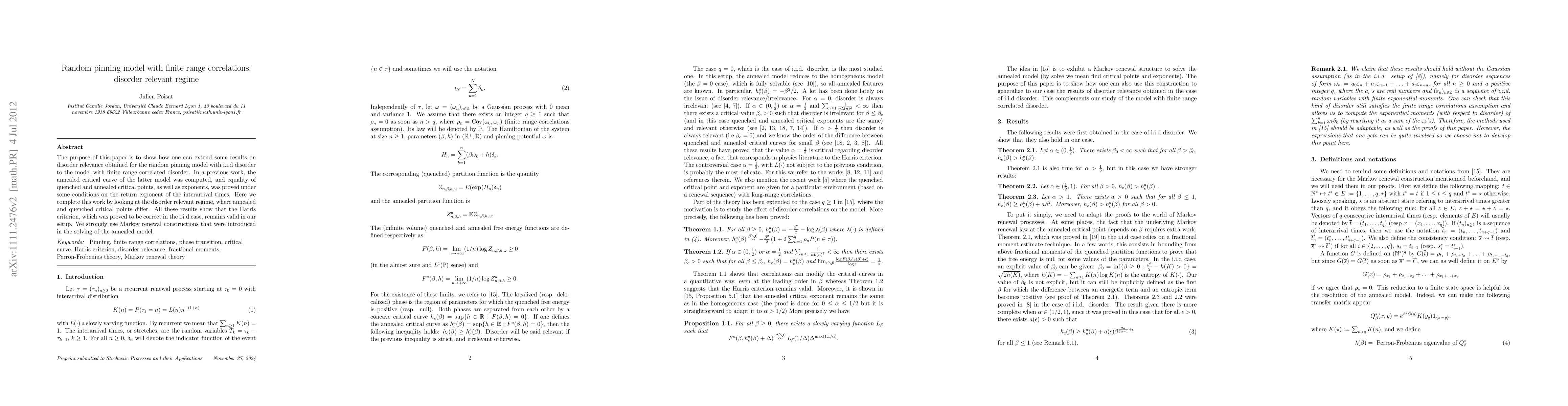 This paper extends results on disorder relevance from the random pinning model with independent and identically distributed (i.i.d) disorder to one with finite range correlated disorder. It confirms the validity of the Harris criterion in this setup and explores the disorder relevant regime where annealed and quenched critical points differ, using Markov renewal constructions.