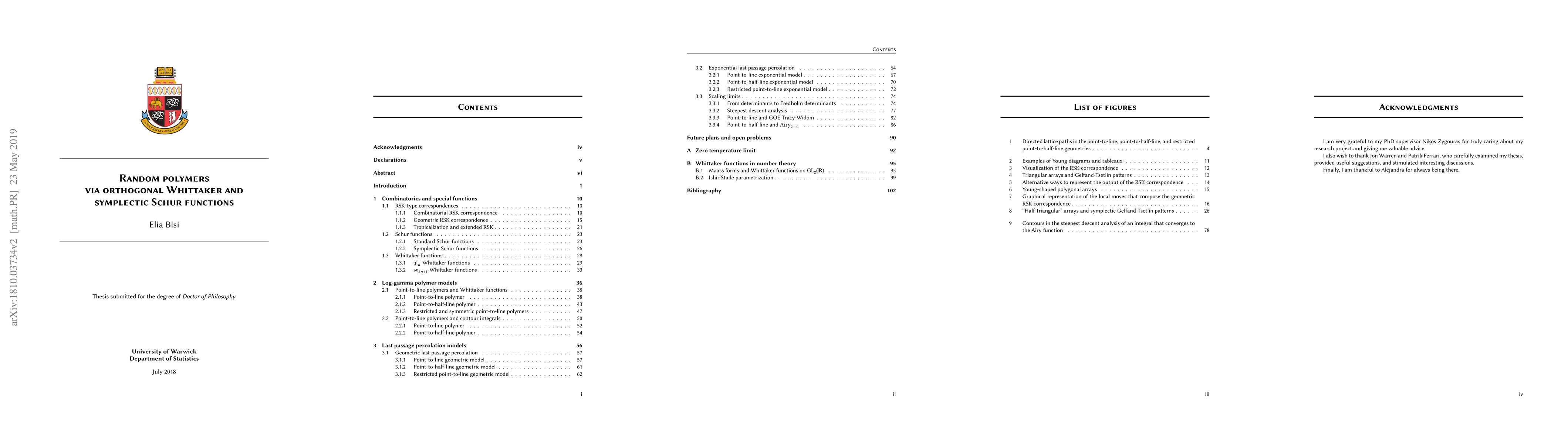 This thesis deals with some $(1+1)$-dimensional lattice path models from the KPZ universality class: the directed random polymer with inverse-gamma weights (known as log-gamma polymer) and its zero temperature degeneration, i.e. the last passage percolation model, with geometric or exponential waiting times. We consider three path geometries: point-to-line, point-to-half-line, and point-to-line with paths restricted to stay in a half-plane. Through exact formulas, we establish new connections between integrable probabilistic models and the ubiquitous Whittaker and Schur functions. More in detail, via the use of A. N. Kirillov's geometric Robinson-Schensted-Knuth (RSK) correspondence, we compute the Laplace transform of the polymer partition functions in the above geometries in terms of orthogonal Whittaker functions. In the case of the first two geometries we also provide multiple contour integral formulas. For the corresponding last passage percolation problems, we obtain new formulas in terms of symplectic Schur functions, both directly via RSK on polygonal arrays and via zero temperature limit from the log-gamma polymer formulas. As scaling limits of the point-to-line and point-to-half-line models with exponential waiting times, we derive Sasamoto's Fredholm determinant formula for the GOE Tracy-Widom distribution, as well as the one-point marginal distribution of the ${\rm Airy}_{2\to1}$ process.