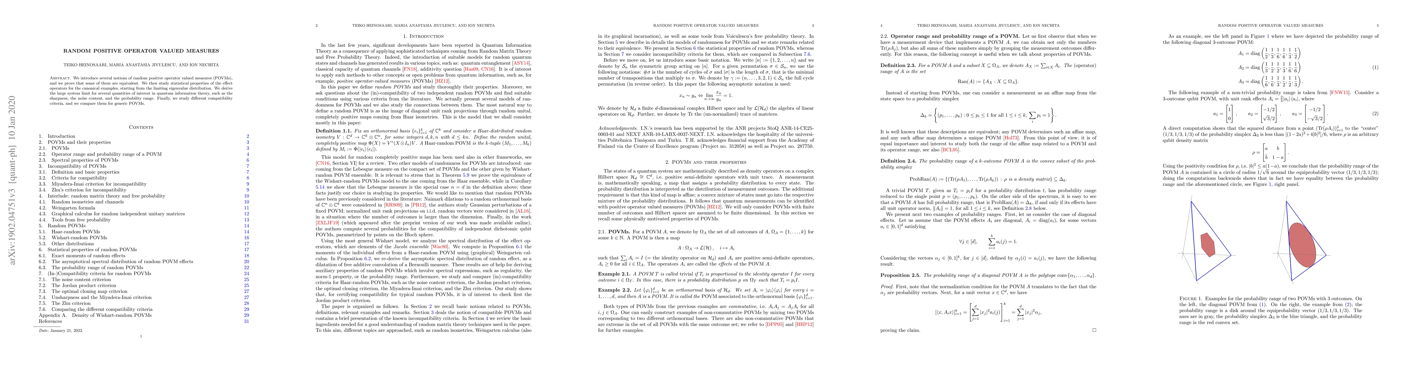 This paper introduces various notions of random positive operator valued measures (POVMs) and proves their equivalence. It employs free probability theory to derive limiting eigenvalue distributions and large system limits for quantum information quantities, and examines compatibility criteria for generic POVMs.
