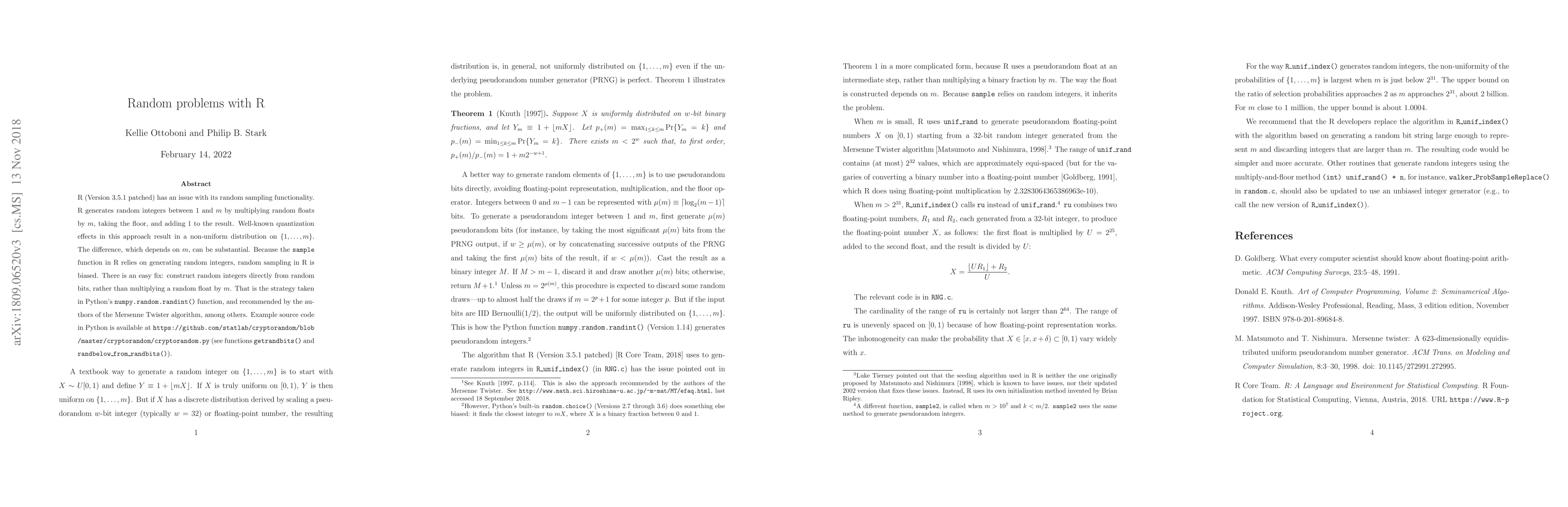 R (Version 3.5.1 patched) has an issue with its random sampling functionality. R generates random integers between $1$ and $m$ by multiplying random floats by $m$, taking the floor, and adding $1$ to the result. Well-known quantization effects in this approach result in a non-uniform distribution on $\{ 1, \ldots, m\}$. The difference, which depends on $m$, can be substantial. Because the sample function in R relies on generating random integers, random sampling in R is biased. There is an easy fix: construct random integers directly from random bits, rather than multiplying a random float by $m$. That is the strategy taken in Python's numpy.random.randint() function, among others. Example source code in Python is available at https://github.com/statlab/cryptorandom/blob/master/cryptorandom/cryptorandom.py (see functions getrandbits() and randbelow_from_randbits()).