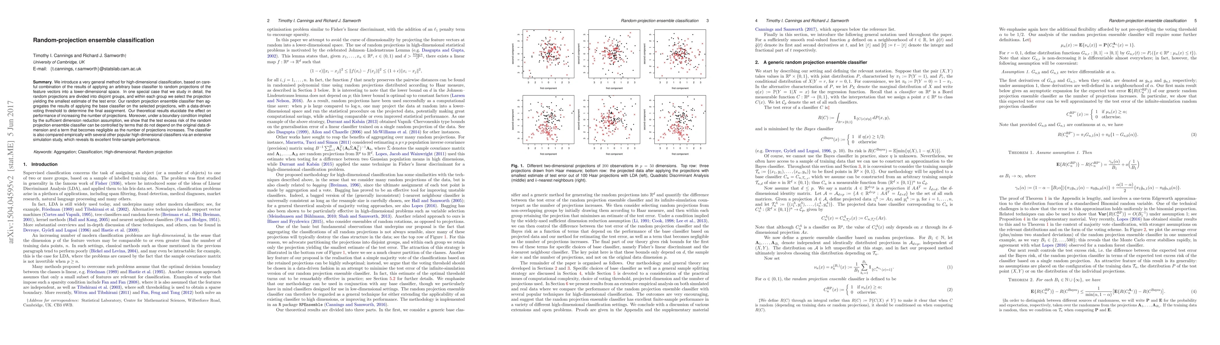 This paper proposes a random-projection ensemble classifier for high-dimensional data classification, combining results from base classifiers applied to lower-dimensional projections. The method shows controlled test excess risk and outperforms other classifiers in simulations, demonstrating its effectiveness.