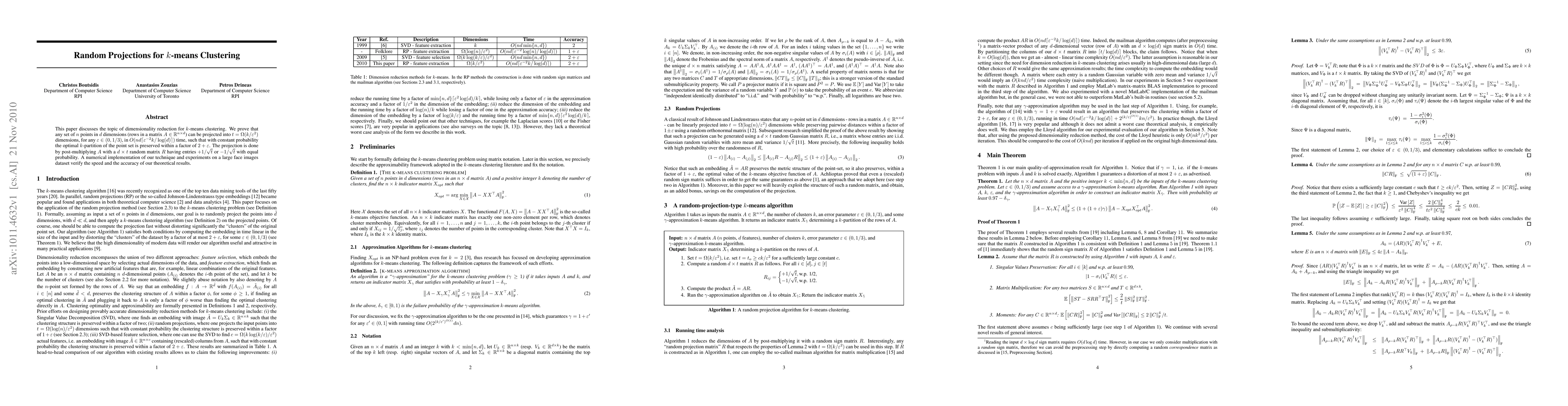 This paper proposes a method for dimensionality reduction in $k$-means clustering using random projections, proving that $n$ points in $d$ dimensions can be projected into $t$ dimensions in $O(n d \lceil \eps^{-2} k/ \log(d) \rceil)$ time while preserving the optimal $k$-partition with constant probability. Experiments on a face images dataset confirm the technique's efficiency and accuracy.