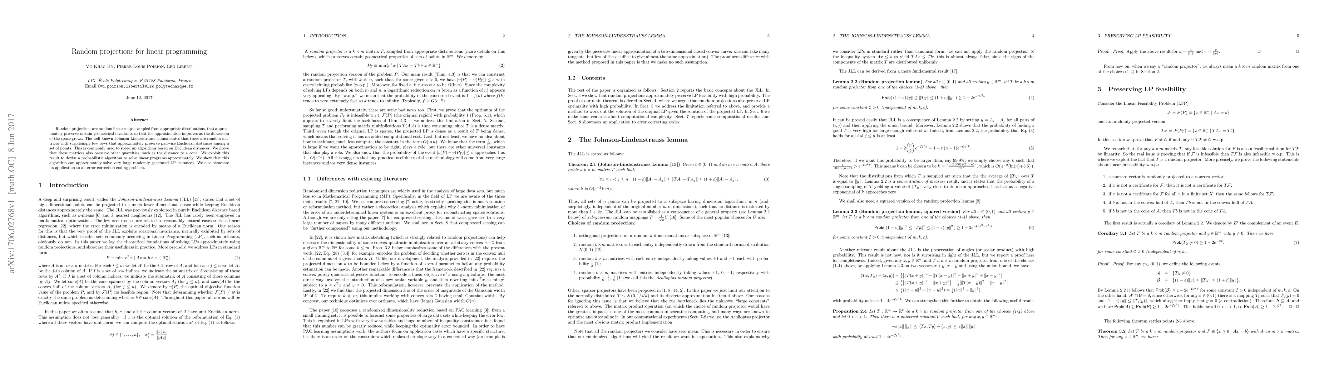 Random projections are random linear maps, sampled from appropriate distributions, that approx- imately preserve certain geometrical invariants so that the approximation improves as the dimension of the space grows. The well-known Johnson-Lindenstrauss lemma states that there are random ma- trices with surprisingly few rows that approximately preserve pairwise Euclidean distances among a set of points. This is commonly used to speed up algorithms based on Euclidean distances. We prove that these matrices also preserve other quantities, such as the distance to a cone. We exploit this result to devise a probabilistic algorithm to solve linear programs approximately. We show that this algorithm can approximately solve very large randomly generated LP instances. We also showcase its application to an error correction coding problem.