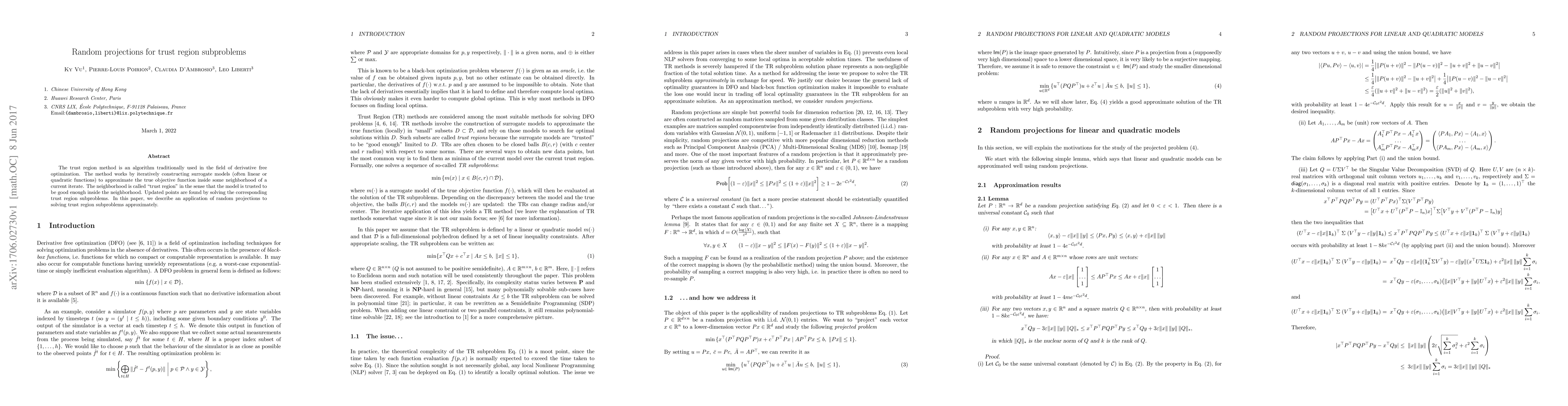 This paper explores the use of random projections to efficiently solve trust region subproblems in derivative-free optimization, offering an approximate yet computationally feasible method to construct surrogate models.