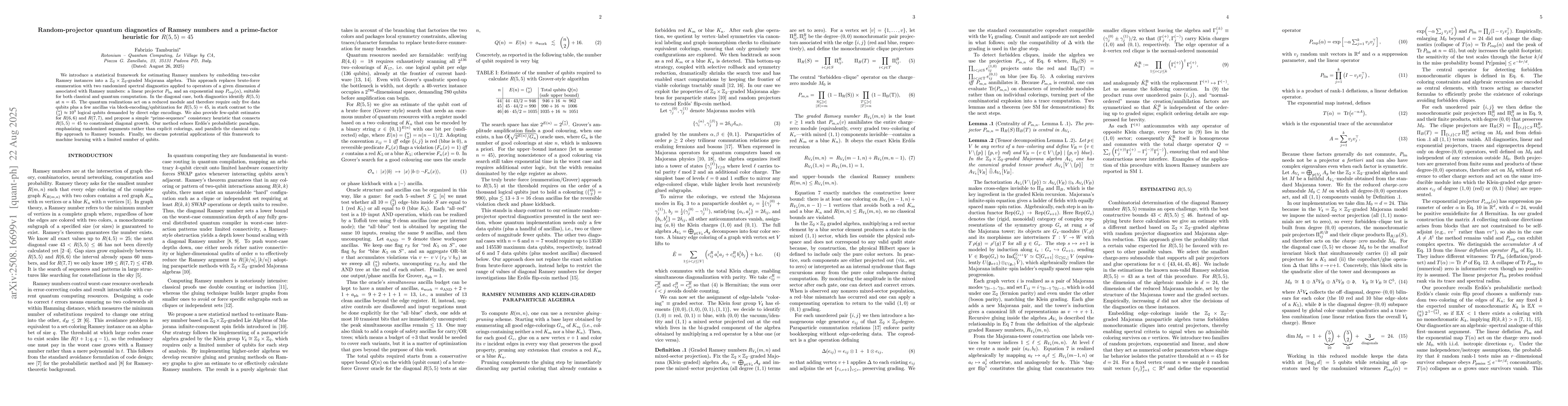 We introduce a statistical framework for estimating Ramsey numbers by embedding two-color Ramsey instances into a $Z_2 \times Z_2$-graded Majorana algebra. This approach replaces brute-force enumeration with two randomized spectral diagnostics applied to operators of a given dimension d associated with Ramsey numbers: a linear projector $P_{lin}$ and an exponential map $P_{exp}(\alpha)$, suitable for both classical and quantum computation. In the diagonal case, both diagnostics identify R(5,5) at n=45. The quantum realizations act on a reduced module and therefore require only five data qubits plus a few ancillas via block-encoding/qubitization for R(5,5)=45, in stark contrast to the $\binom{n}{2} \approx 10^3$ logical qubits demanded by direct edge encodings. We also provide few-qubit estimates for R(6,6) and R(7,7), and propose a simple "prime-sequence" consistency heuristic that connects R(5,5)=45 to constrained diagonal growth. Our method echoes Erd\H{o}s's probabilistic paradigm, emphasizing randomized arguments rather than explicit colorings, and parallels the classical coin-flip approach to Ramsey bounds. Finally, we discuss potential applications of this framework to machine learning with a limited number of qubits.