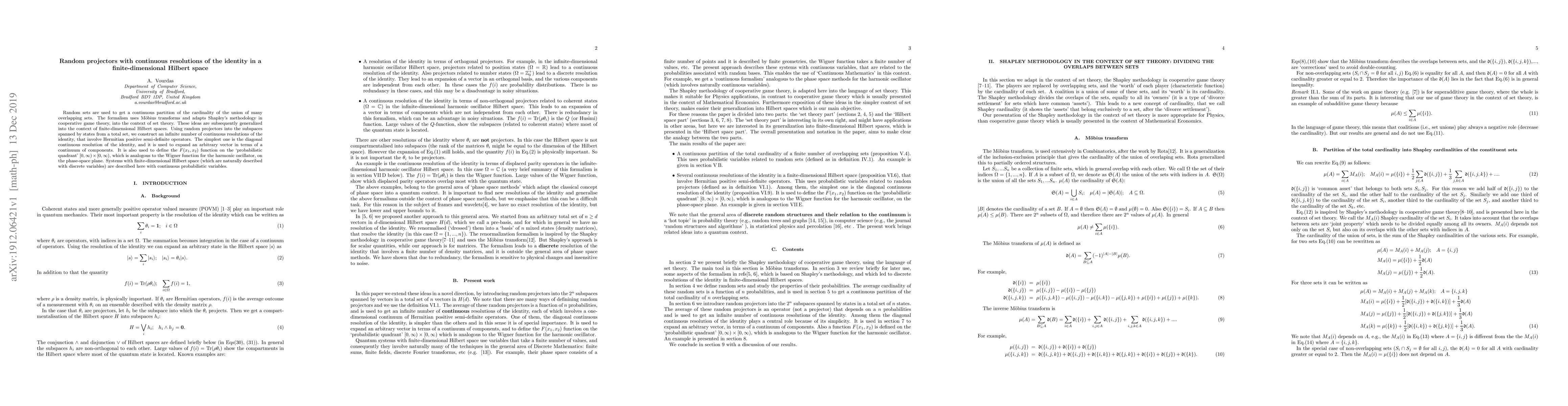 Random sets are used to get a continuous partition of the cardinality of the union of many overlapping sets. The formalism uses M\"obius transforms and adapts Shapley's methodology in cooperative game theory, into the context of set theory. These ideas are subsequently generalized into the context of finite-dimensional Hilbert spaces. Using random projectors into the subspaces spanned by states from a total set, we construct an infinite number of continuous resolutions of the identity, that involve Hermitian positive semi-definite operators. The simplest one is the diagonal continuous resolution of the identity, and it is used to expand an arbitrary vector in terms of a continuum of components. It is also used to define the $F(x_1,x_2)$ function on the `probabilistic quadrant' $[0,\infty) \times [0,\infty)$, which is analogous to the Wigner function for the harmonic oscillator, on the phase-space plane. Systems with finite-dimensional Hilbert space (which are naturally described with discrete variables) are described here with continuous probabilistic variables.