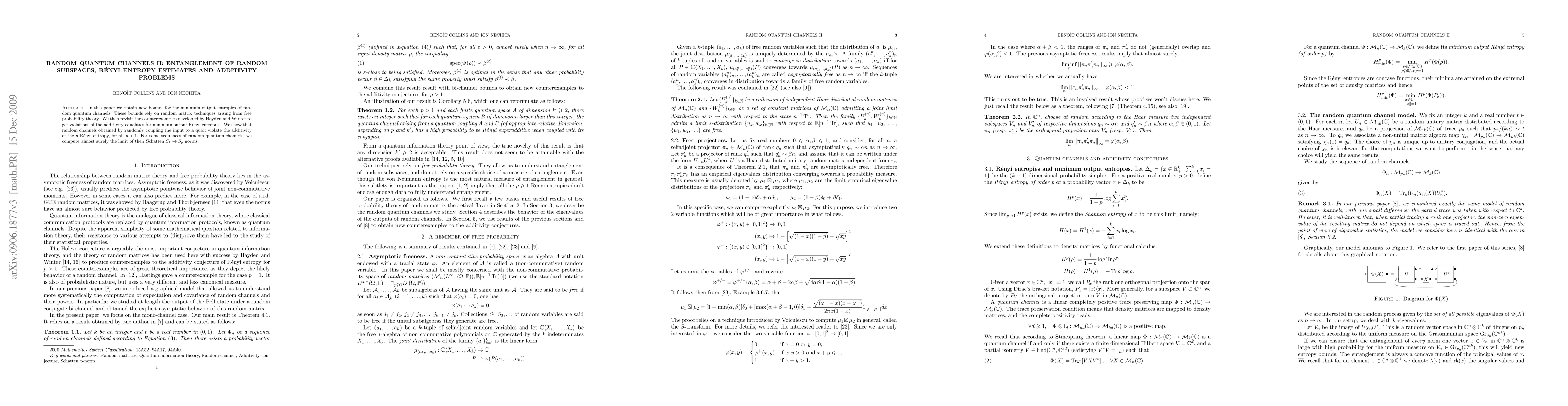 This paper establishes new bounds for minimum output entropies of random quantum channels using free probability theory, and demonstrates violations of the additivity conjecture for minimum output Rényi entropies through random coupling of qubits. It also computes the almost sure limit of Schatten norms for certain sequences of random quantum channels.