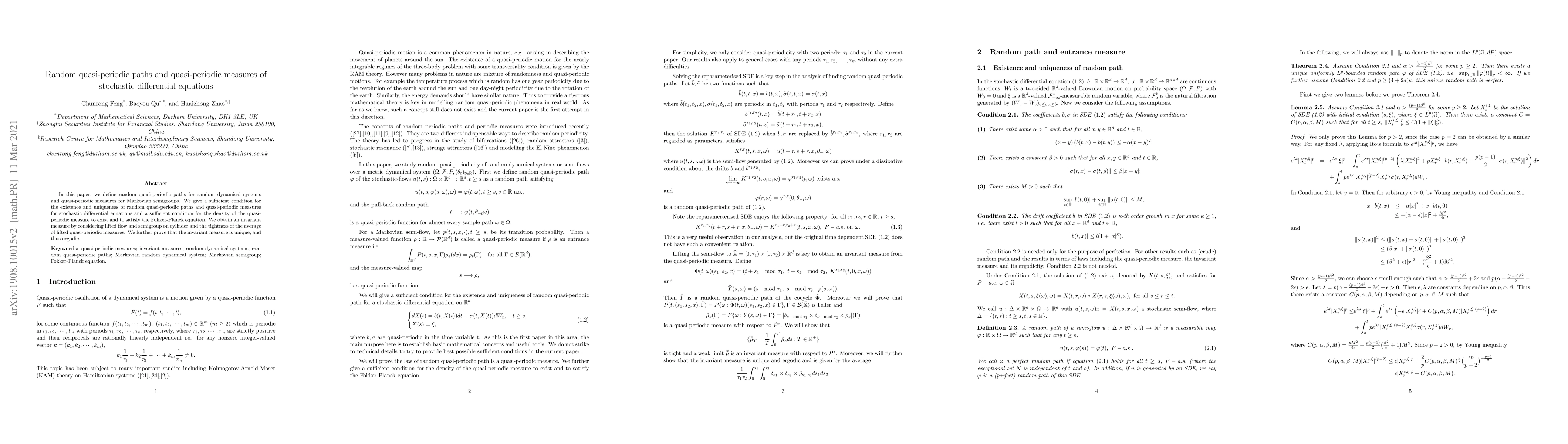 This paper defines random quasi-periodic paths and quasi-periodic measures for stochastic differential equations, providing sufficient conditions for their existence and uniqueness. It also establishes the density of the quasi-periodic measure and proves the uniqueness and ergodicity of the invariant measure.