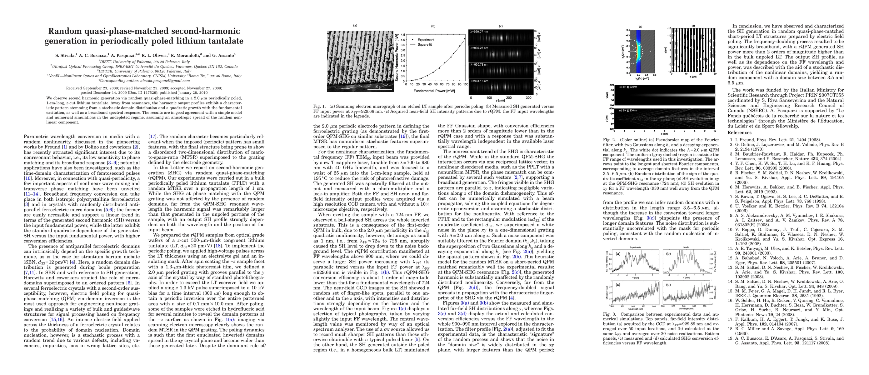 Summary: This study demonstrates random quasi-phase-matched second-harmonic generation in periodically poled lithium tantalate, showing a broadband spectral response and quadratic growth with fundamental excitation, consistent with a model of anisotropic random nonlinear components. Numerical simulations support the observed stochastic domain distribution effects.