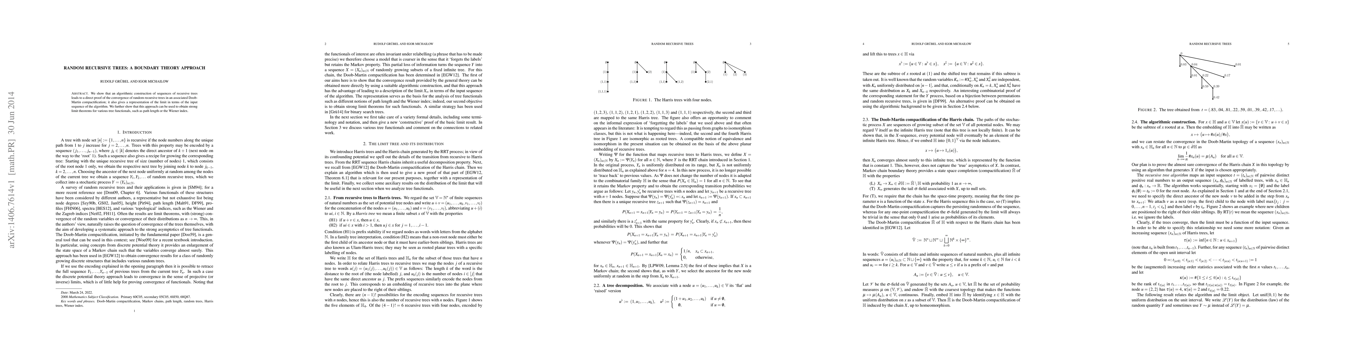 We show that an algorithmic construction of sequences of recursive trees leads to a direct proof of the convergence of random recursive trees in an associated Doob-Martin compactification; it also gives a representation of the limit in terms of the input sequence of the algorithm. We further show that this approach can be used to obtain strong limit theorems for various tree functionals, such as path length or the Wiener index.