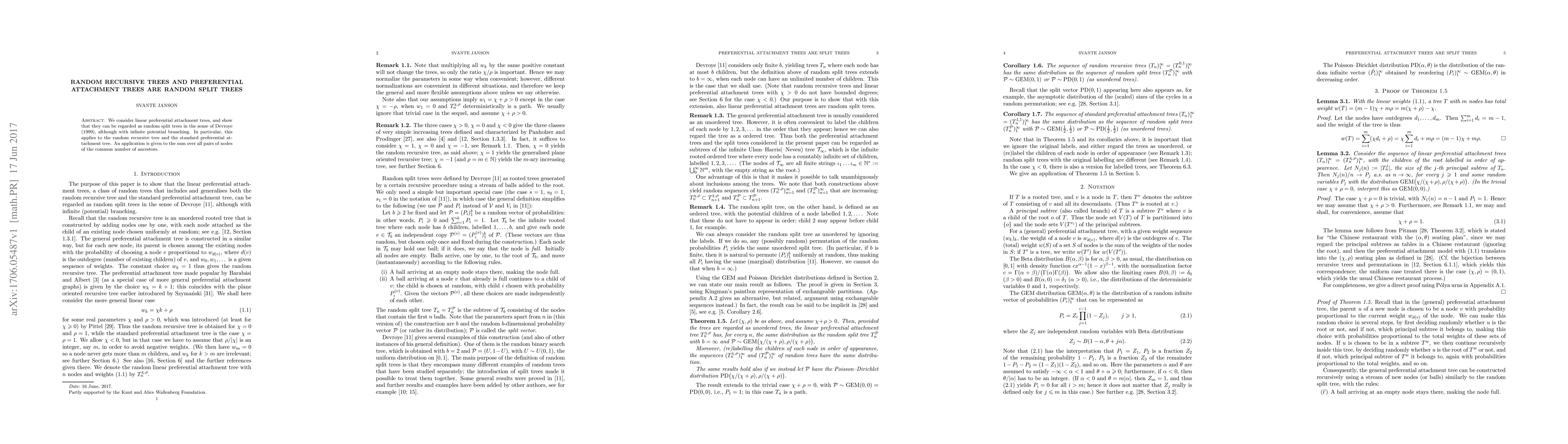 Summary: The paper demonstrates that linear preferential attachment trees, including random recursive trees and standard preferential attachment trees, can be viewed as random split trees with infinite potential branching. An application focuses on the sum of common ancestors across all node pairs.