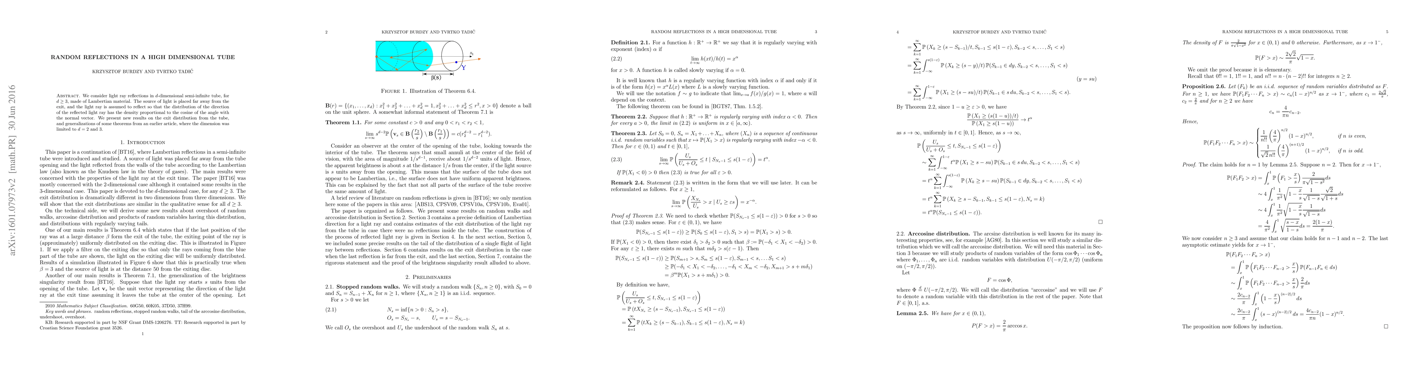 We consider light ray reflections in $n$-dimensional semi-infinite tube, for $n\geq 3$, made of Lambertian material. The source of light is placed far away from the exit, and the light ray is assumed to reflect so that the distribution of the direction of the reflected light ray has the density proportional to the cosine of the angle with the normal vector. We present new results on the exit distribution from the tube, and generalizations of some theorems from an earlier article, where the dimension was limited to $n=2$ and $3$.