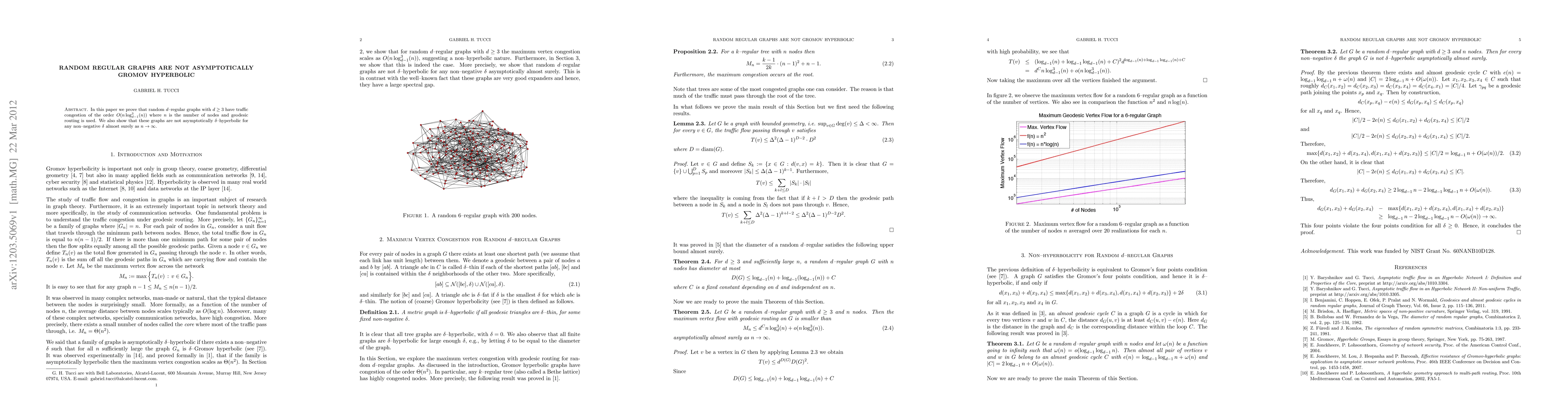 In this paper we prove that random $d$--regular graphs with $d\geq 3$ have traffic congestion of the order $O(n\log_{d-1}^{3}(n))$ where $n$ is the number of nodes and geodesic routing is used. We also show that these graphs are not asymptotically $\delta$--hyperbolic for any non--negative $\delta$ almost surely as $n\to\infty$.