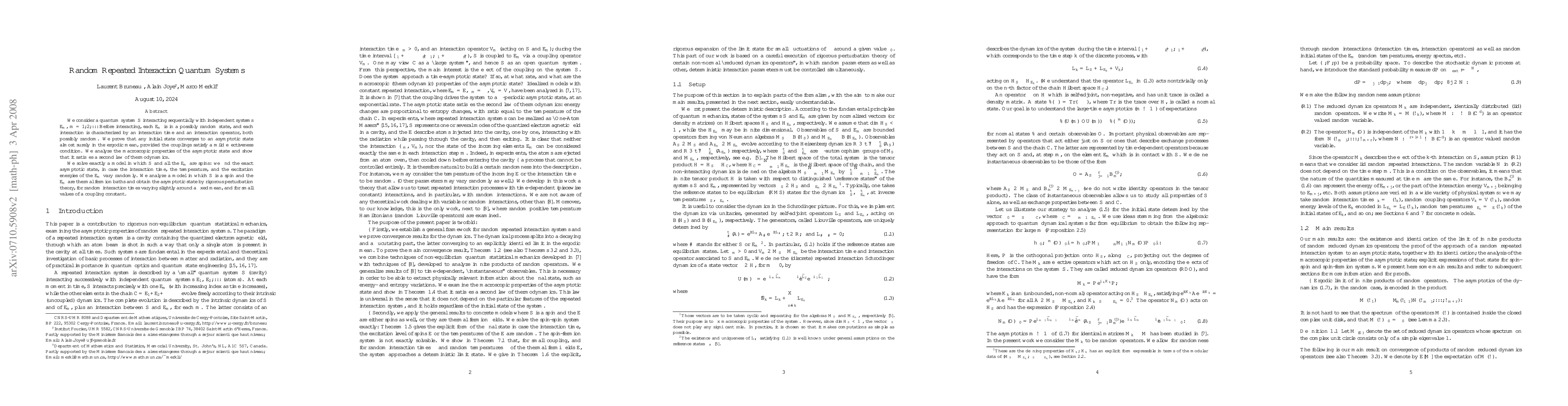 This paper investigates quantum systems that repeatedly interact with independently random systems, proving that any initial state converges to an asymptotic state under mild conditions. It rigorously analyzes the macroscopic properties of this state, demonstrating thermodynamic behavior, and solves exact models for spin systems and thermal fermion baths.