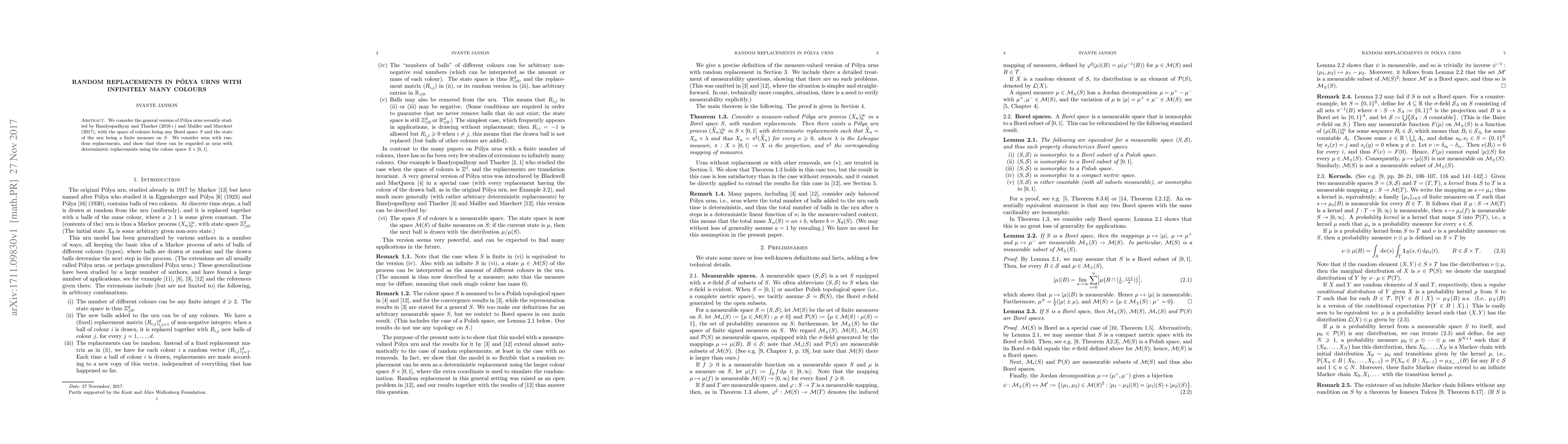 Summary: This paper extends the study of Pólya urns to include a Borel space $S$ for colours and random replacements, demonstrating that such urns can equivalently be viewed as deterministic replacements in an extended space $S\times[0,1]$.