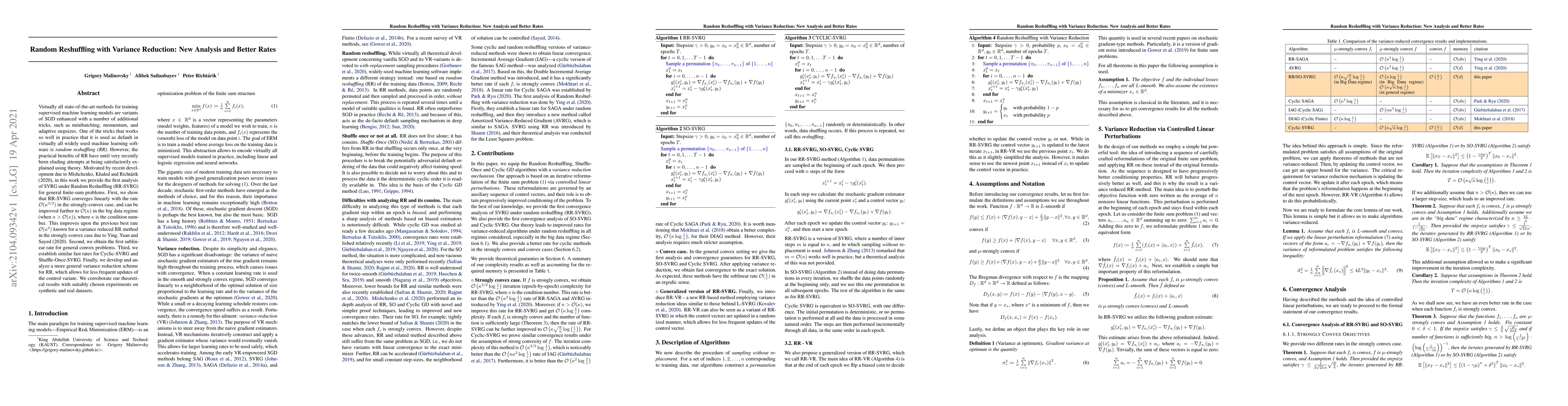 Virtually all state-of-the-art methods for training supervised machine learning models are variants of SGD enhanced with a number of additional tricks, such as minibatching, momentum, and adaptive stepsizes. One of the tricks that works so well in practice that it is used as default in virtually all widely used machine learning software is {\em random reshuffling (RR)}. However, the practical benefits of RR have until very recently been eluding attempts at being satisfactorily explained using theory. Motivated by recent development due to Mishchenko, Khaled and Richt\'{a}rik (2020), in this work we provide the first analysis of SVRG under Random Reshuffling (RR-SVRG) for general finite-sum problems. First, we show that RR-SVRG converges linearly with the rate $\mathcal{O}(\kappa^{3/2})$ in the strongly-convex case, and can be improved further to $\mathcal{O}(\kappa)$ in the big data regime (when $n > \mathcal{O}(\kappa)$), where $\kappa$ is the condition number. This improves upon the previous best rate $\mathcal{O}(\kappa^2)$ known for a variance reduced RR method in the strongly-convex case due to Ying, Yuan and Sayed (2020). Second, we obtain the first sublinear rate for general convex problems. Third, we establish similar fast rates for Cyclic-SVRG and Shuffle-Once-SVRG. Finally, we develop and analyze a more general variance reduction scheme for RR, which allows for less frequent updates of the control variate. We corroborate our theoretical results with suitably chosen experiments on synthetic and real datasets.