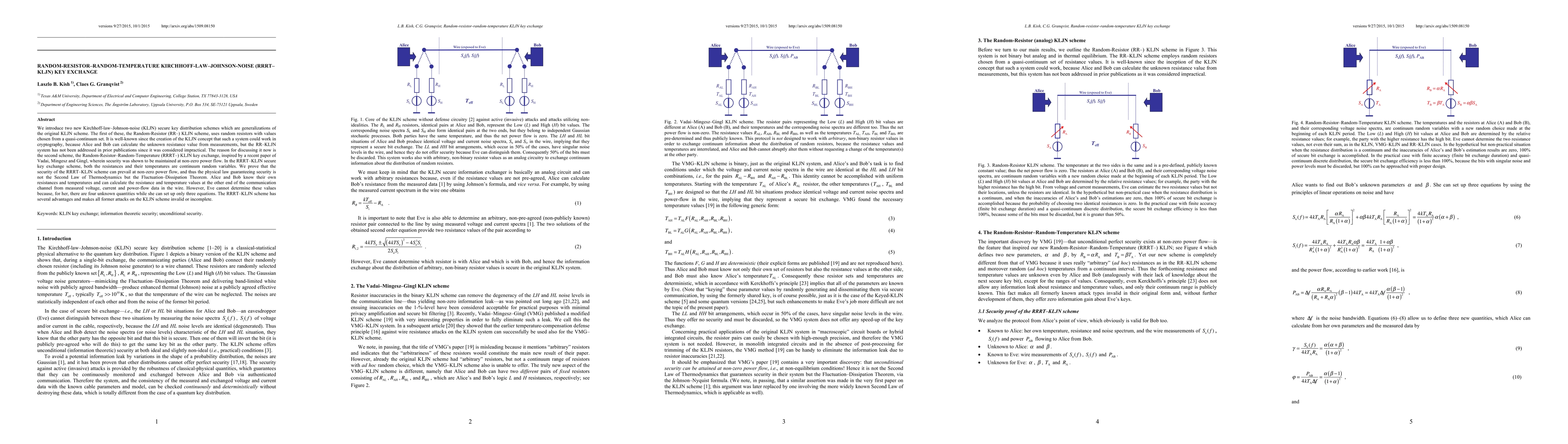 This paper introduces two novel secure key distribution schemes based on Kirchhoff-law-Johnson-noise (KLJN): the Random-Resistor (RR-) KLJN and the Random-Resistor-Random-Temperature (RRRT-) KLJN. The RRRT-KLJN scheme maintains security at non-zero power flow, relying on the Fluctuation-Dissipation Theorem rather than the Second Law of Thermodynamics, rendering former attacks ineffective.