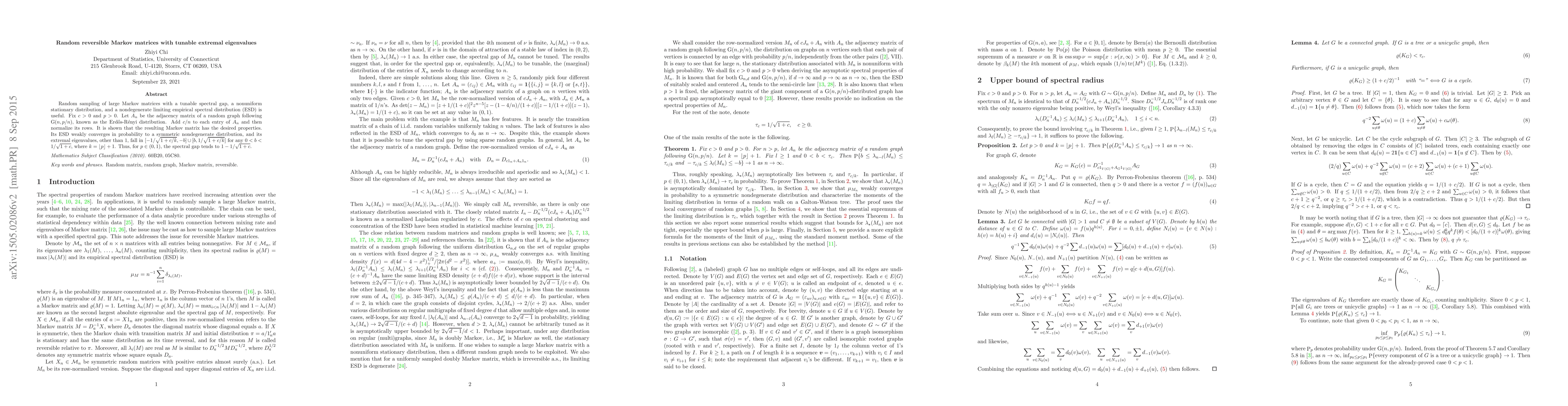 Random sampling of large Markov matrices with a tunable spectral gap, a nonuniform stationary distribution, and a nondegenerate limiting empirical spectral distribution (ESD) is useful. Fix $c>0$ and $p>0$. Let $A_n$ be the adjacency matrix of a random graph following $\mathrm{G}(n, p/n)$, known as the Erd\H{o}s-R\'enyi distribution. Add $c/n$ to each entry of $A_n$ and then normalize its rows. It is shown that the resulting Markov matrix has the desired properties. Its ESD weakly converges in probability to a symmetric nondegenerate distribution, and its extremal eigenvalues, other than 1, fall in $[-1/\sqrt{1+c/k},-b]\cup [b,1/\sqrt{1+c/k}]$ for any $0< b < 1/\sqrt{1+c}$, where $k = \lfloor p \rfloor + 1$. Thus, for $p\in (0,1)$, the spectral gap tends to $1-1/\sqrt{1+c}$.