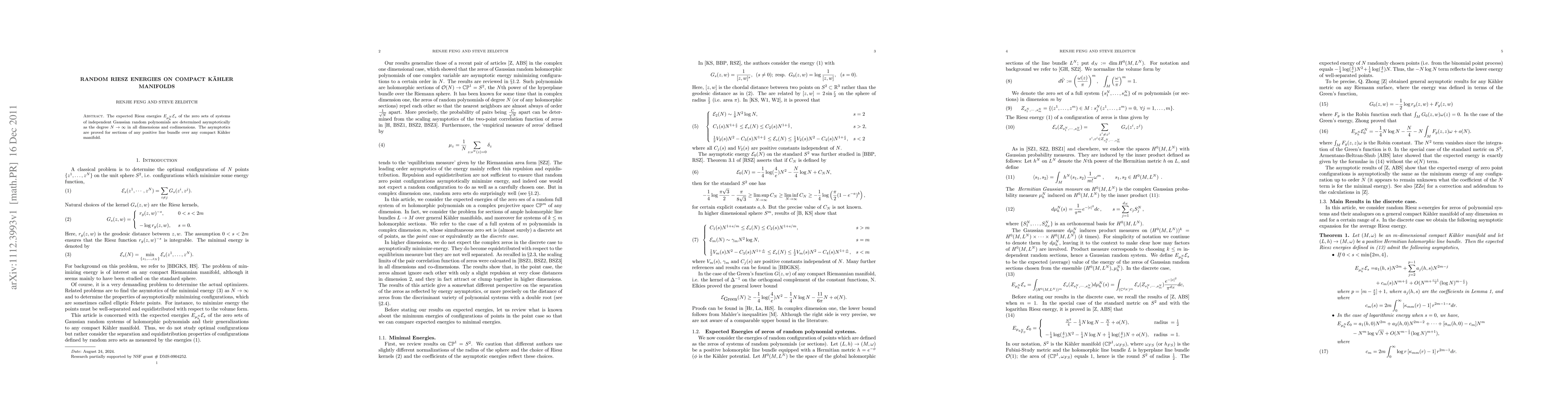This article determines the asymptotics of the expected Riesz s-energy of the zero set of a Gaussian random systems of polynomials of degree N as the degree N tends to infinity in all dimensions and codimensions. The asymptotics are proved more generally for sections of any positive line bundle over any compact Kaehler manifold. In comparison with the results on energies of zero sets in one complex dimension due to Qi Zhong (arXiv:0705.2000) (see also [arXiv:0705.2000]), the zero sets have higher energies than randomly chosen points in dimensions > 2 due to clumping of zeros.