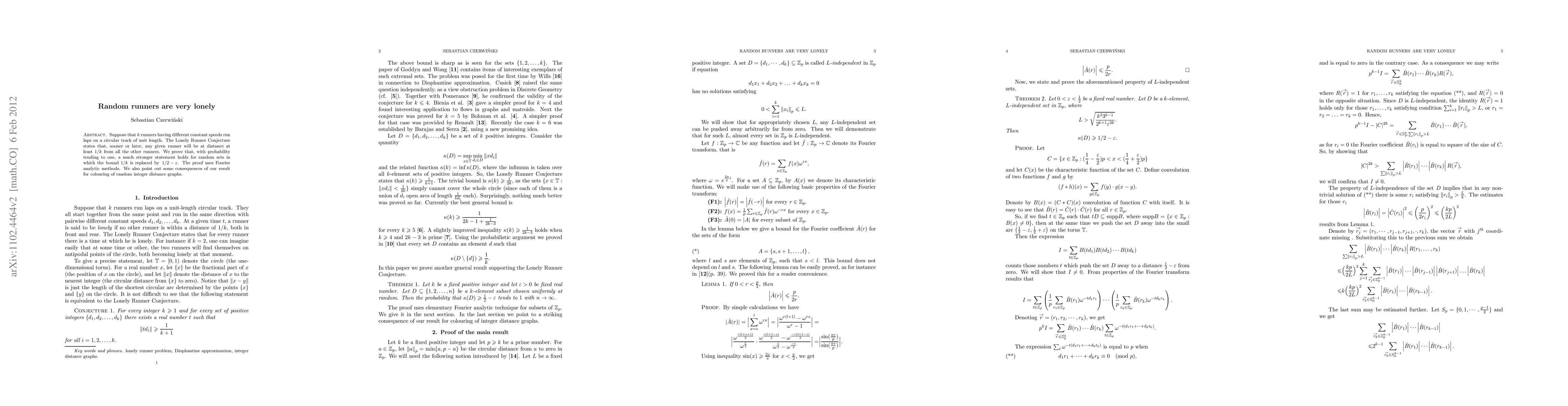 This paper proves that, with high probability, random sets of $k$ runners on a circular track will eventually ensure that any given runner is at least $1/2-\varepsilon$ away from all others, using Fourier analysis. It also discusses implications for coloring random integer distance graphs.