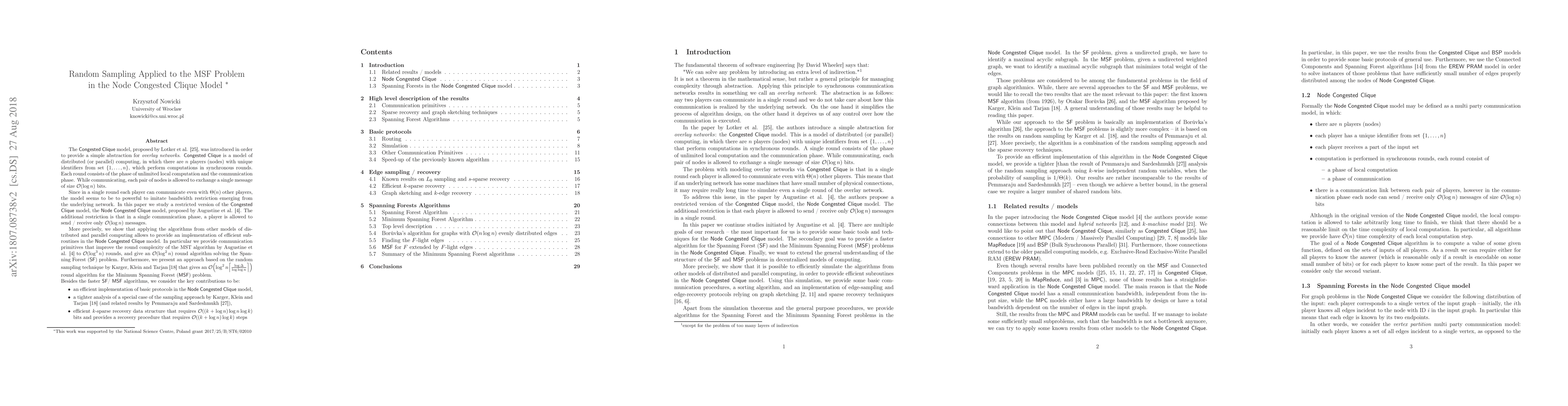 The Congested Clique model proposed by Lotker et al.[SICOMP'05] was introduced in order to provide a simple abstraction for overlay networks. Congested Clique is a model of distributed (or parallel) computing, in which there are $n$ players with unique identifiers from set [n], which perform computations in synchronous rounds. Each round consists of the phase of unlimited local computation and the communication phase. While communicating, each pair of players is allowed to exchange a single message of size $O(\log n)$ bits. Since, in a single round, each player can communicate with even $\Theta(n)$ other players, the model seems to be to powerful to imitate bandwidth restriction emerging from the underlying network. In this paper we study a restricted version of the Congested Clique model, the Node Congested Clique (NCC) model, proposed by Augustine et al.[arxiv1805], in which a player is allowed to send/receive only $O(\log n)$ messages per communication phase. More precisely, we provide communication primitives that improve the round complexity of the MST algorithm by Augustine et al. [arxiv1805] to $O(\log^3 n)$ rounds, and give an $O(\log^2 n)$ round algorithm solving the Spanning Forest (SF) problem. Furthermore, we present an approach based on the random sampling technique by Karger et al.[JACM'95] that gives an $O(\log^2 n \log \Delta / \log \log n)$ round algorithm for the Minimum Spanning Forest (MSF) problem. Besides the faster SF/ MSF algorithms we consider the key contributions to be - an efficient implementation of basic protocols in the NCC model - a tighter analysis of a special case of the sampling approach by Karger et al.[JACM'95] and related results by Pemmaraju and Sardeshmukh [FSTTCS'16] - efficient k-sparse recovery data structure that requires $O((k +\log n)\log n\log k)$ bits and provides recovery procedure that requires $O((k +\log n)\log k)$ steps
