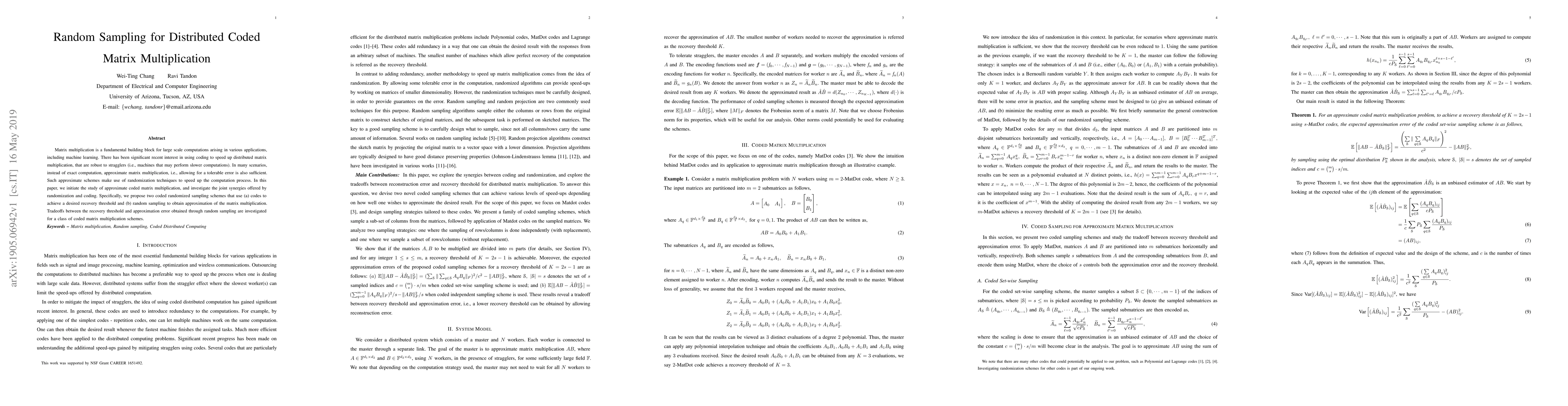 The paper proposes two coded randomized sampling schemes for approximate matrix multiplication, utilizing coding to achieve a desired recovery threshold and random sampling to approximate the multiplication. It investigates tradeoffs between recovery threshold and approximation error for a class of coded matrix multiplication schemes.