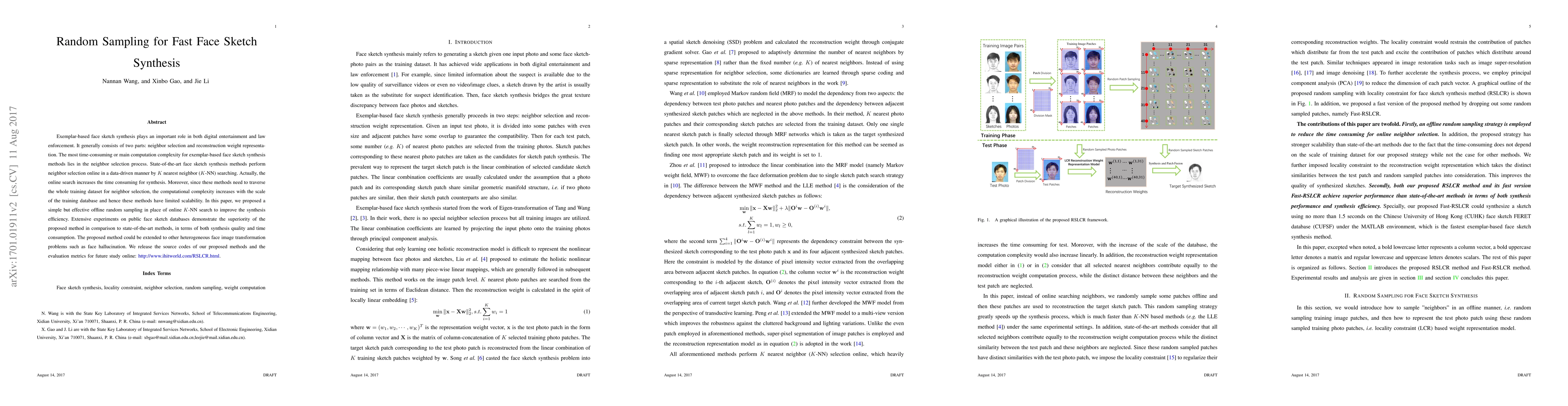 This paper proposes an offline random sampling method to replace the online $K$-NN search for faster face sketch synthesis, significantly reducing computational complexity and improving scalability. The method outperforms state-of-the-art techniques in both synthesis quality and efficiency, as demonstrated by experiments on public databases.