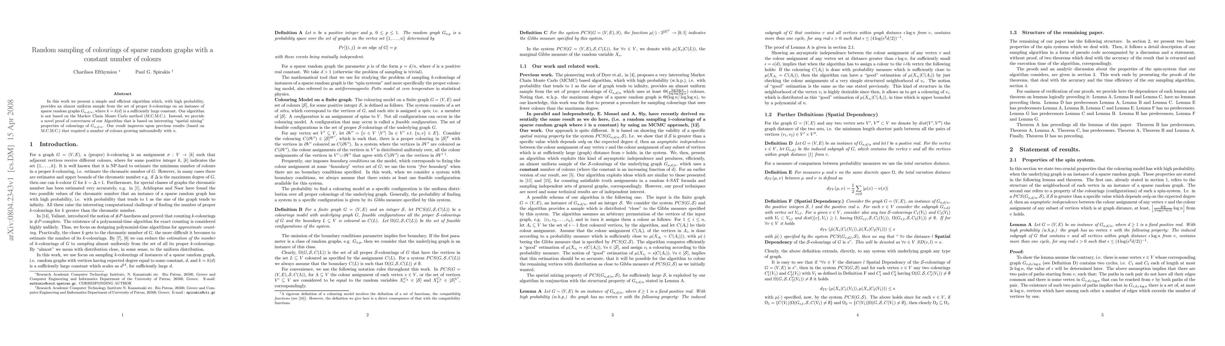 This paper presents an efficient algorithm for uniformly sampling k-colourings of sparse random graphs G(n,d/n) without using Markov Chain Monte Carlo, relying instead on a novel proof based on spatial mixing properties. This approach improves upon previous methods that required the number of colours to grow unboundedly with the size of the graph.