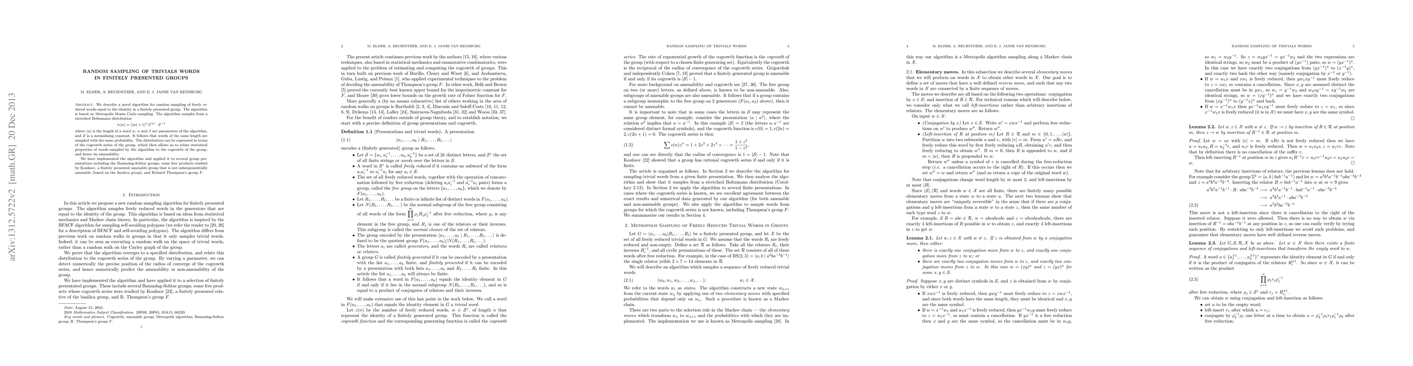 We describe a novel algorithm for random sampling of freely reduced words equal to the identity in a finitely presented group. The algorithm is based on Metropolis Monte Carlo sampling. The algorithm samples from a stretched Boltzmann distribution \begin{align*}\pi(w) &= (|w|+1)^{\alpha} \beta^{|w|} \cdot Z^{-1} \end{align*} where $|w|$ is the length of a word $w$, $\alpha$ and $\beta$ are parameters of the algorithm, and $Z$ is a normalising constant. It follows that words of the same length are sampled with the same probability. The distribution can be expressed in terms of the cogrowth series of the group, which then allows us to relate statistical properties of words sampled by the algorithm to the cogrowth of the group, and hence its amenability. We have implemented the algorithm and applied it to several group presentations including the Baumslag-Solitar groups, some free products studied by Kouksov, a finitely presented amenable group that is not subexponentially amenable (based on the basilica group), and Richard Thompson's group $F$.