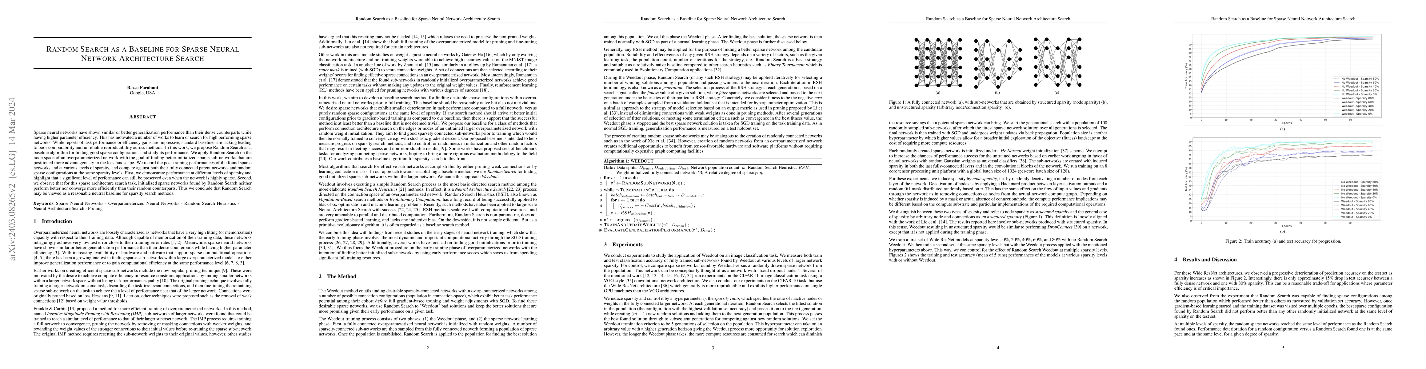 This research proposes Random Search as a baseline for discovering effective sparse neural network configurations, showing that it neither outperforms nor converges more efficiently than random sparse configurations. It demonstrates that substantial performance can be maintained even in highly sparse networks, thus establishing Random Search as a neutral baseline for comparing sparsity search methods.