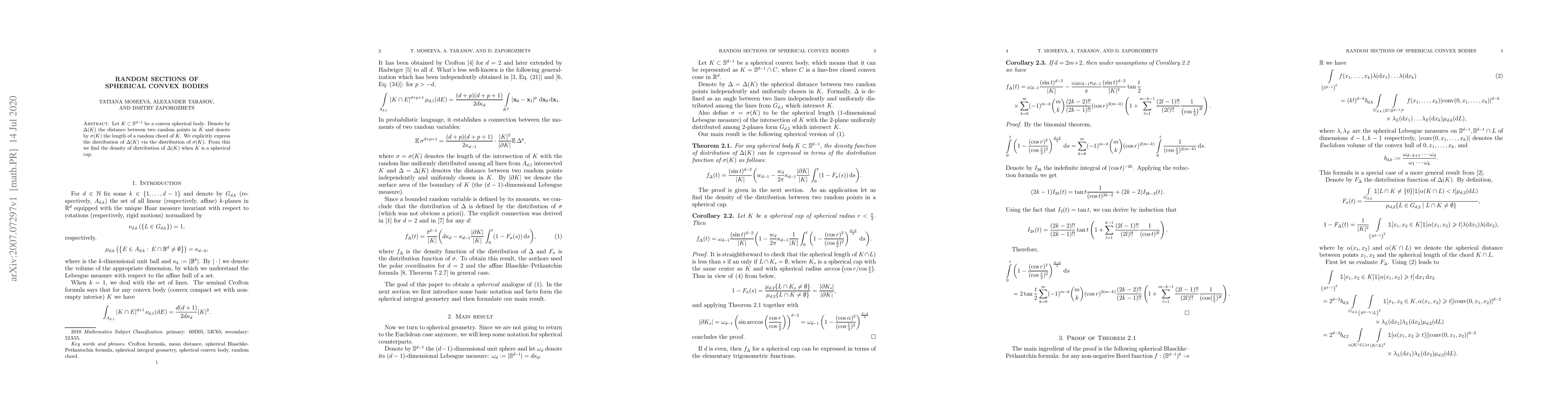 The paper explores the distribution of distances between random points on a convex spherical body, finding an explicit expression for this distribution in terms of another related variable. It also calculates the density of the distribution when the body is a spherical cap.