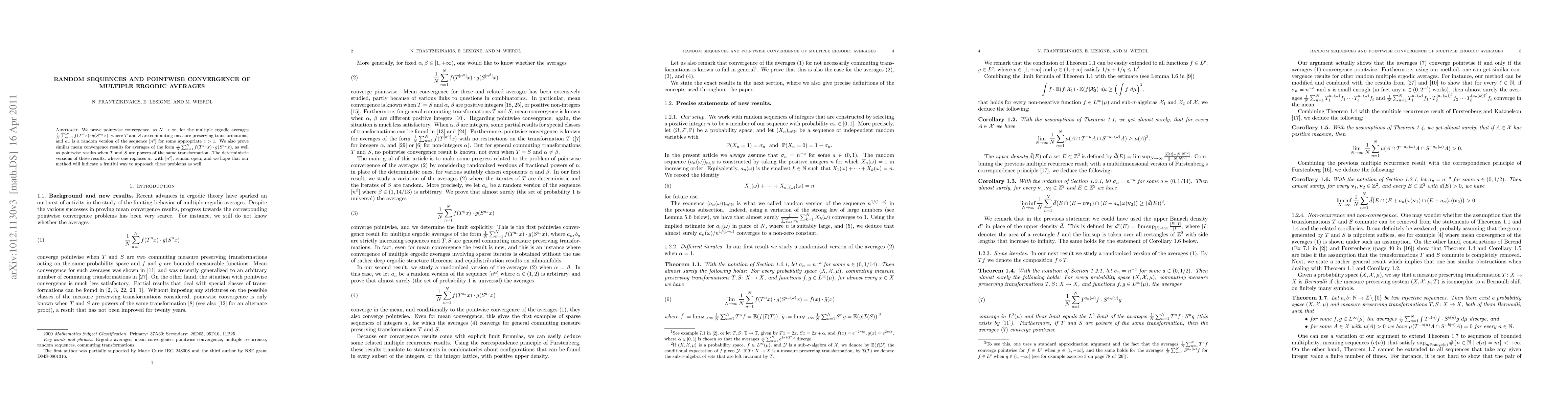 This paper proves pointwise convergence for multiple ergodic averages involving commuting transformations and random sequences, extending beyond deterministic sequences. The method may also offer insights into unresolved deterministic convergence problems.
