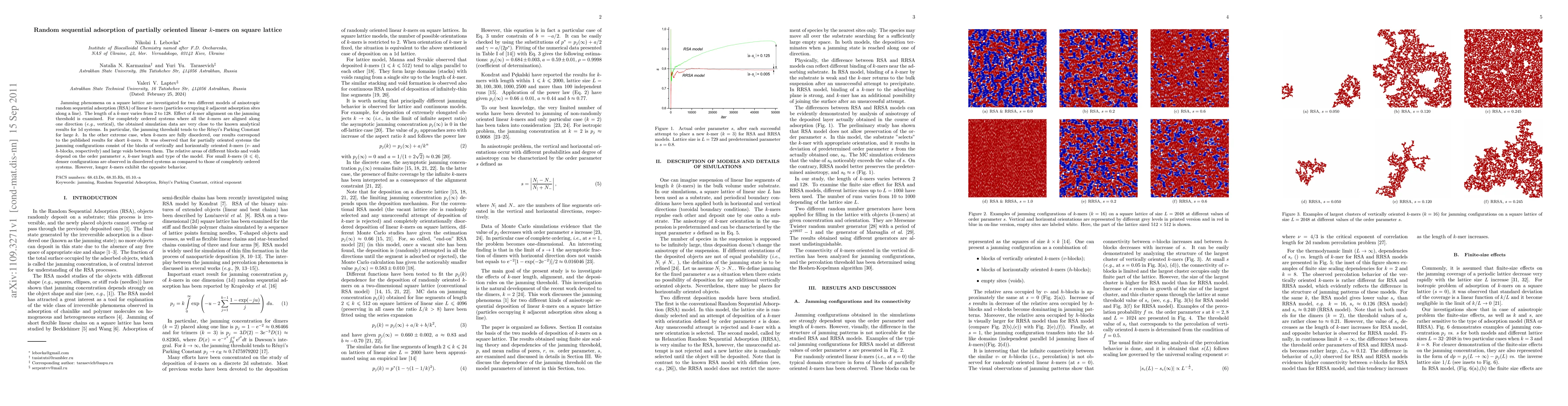 This paper investigates jamming phenomena in random sequential adsorption of partially oriented linear $k$-mers on a square lattice. It finds that jamming thresholds vary significantly with $k$-mer alignment, with ordered systems approaching Rényi's Parking Constant for large $k$, while disordered systems show distinct jamming configurations featuring $v$- and $h$-blocks separated by large voids.