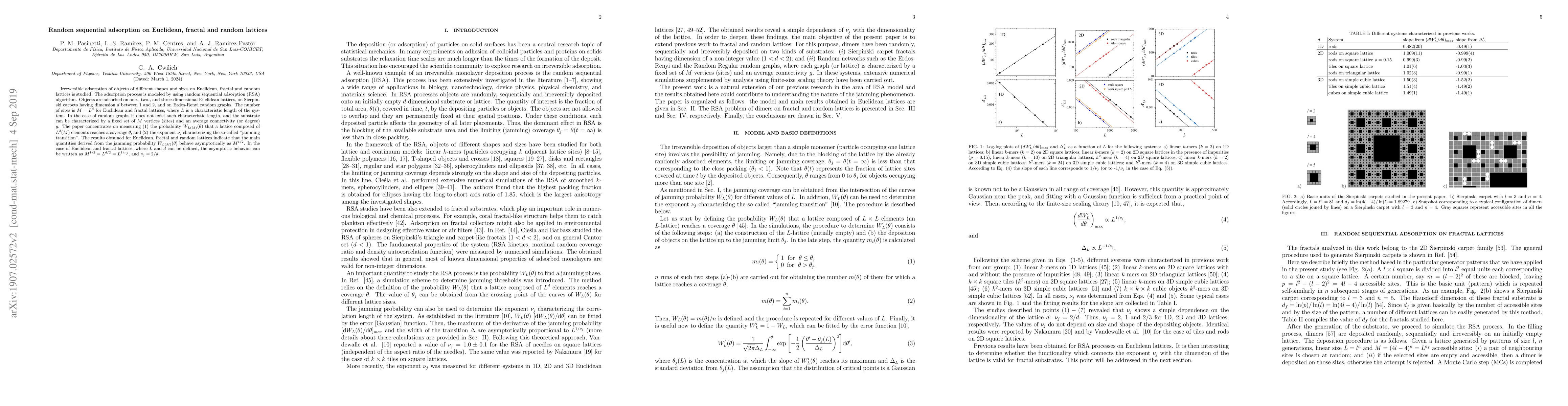 This paper investigates the random sequential adsorption (RSA) of different-shaped objects on Euclidean, fractal, and random lattices, focusing on coverage probability and jamming transition. Results show that key quantities derived from jamming probability behave asymptotically as $M^{1/2}$, with $\nu_j=2/d$ for Euclidean and fractal lattices.