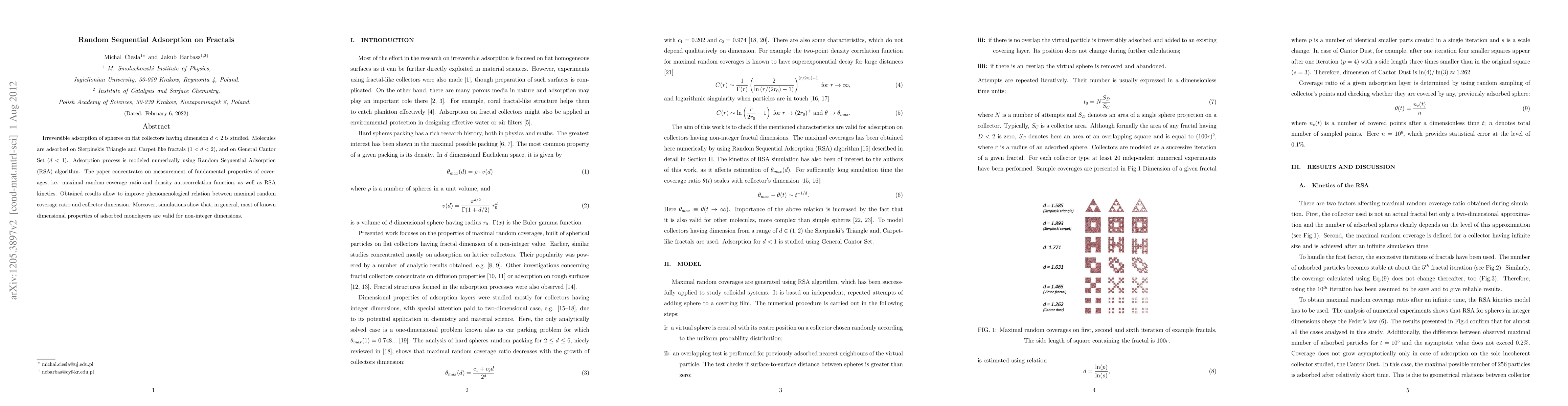 This paper investigates the irreversible adsorption of spherical molecules on fractal surfaces using the Random Sequential Adsorption (RSA) algorithm, focusing on Sierpinski's Triangle, Carpet fractals, and the General Cantor Set. The study reveals that RSA kinetics and the maximal random coverage ratio are valid for non-integer dimensions, improving the understanding of adsorption on fractal collectors.