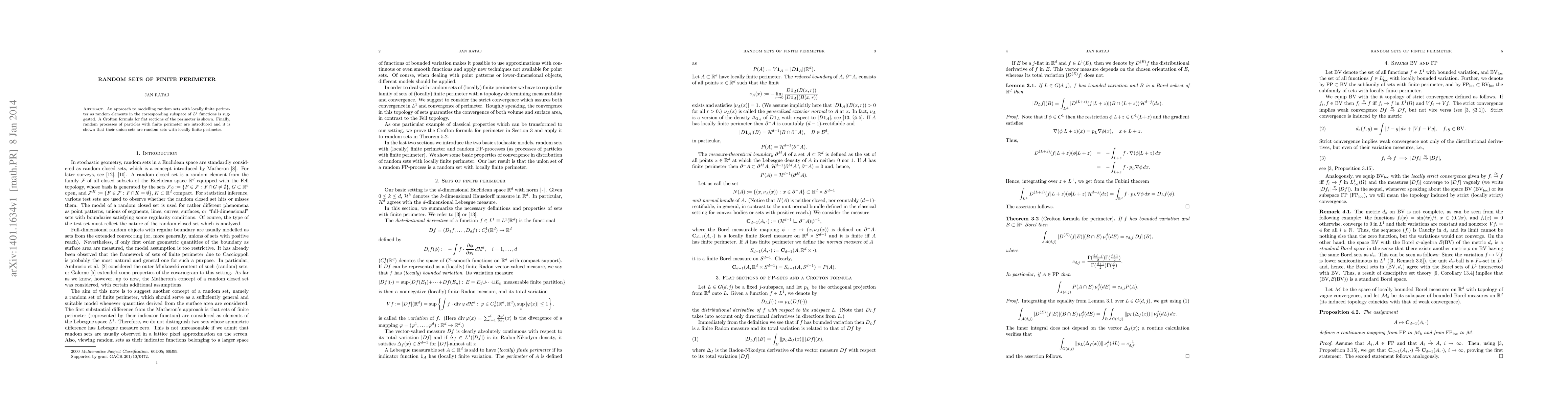 This paper proposes a method to model random sets with locally finite perimeter as elements in the $L^1$ space, derives a Crofton formula for their flat sections, and introduces random processes of particles with finite perimeter, demonstrating that their union sets maintain locally finite perimeter.