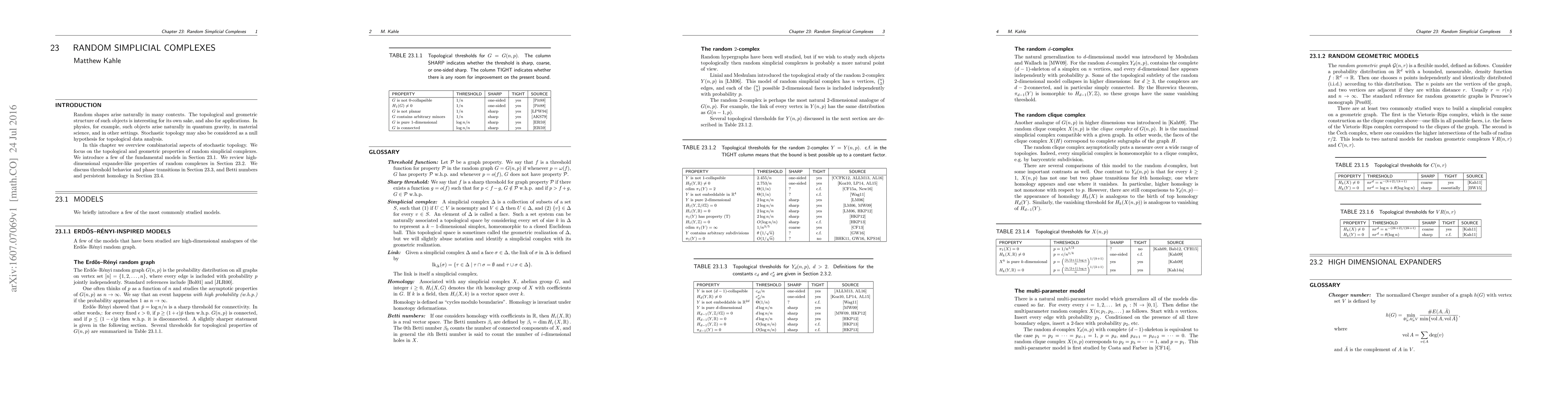 Random shapes arise naturally in many contexts. The topological and geometric structure of such objects is interesting for its own sake, and also for applications. In physics, for example, such objects arise naturally in quantum gravity, in material science, and in other settings. Stochastic topology may also be considered as a null hypothesis for topological data analysis. In this chapter we overview combinatorial aspects of stochastic topology. We focus on the topological and geometric properties of random simplicial complexes. We introduce a few of the fundamental models in Section 23.1. We review high-dimensional expander-like properties of random complexes in Section 23.2. We discuss threshold behavior and phase transitions in Section 23.3, and Betti numbers and persistent homology in Section 23.4.