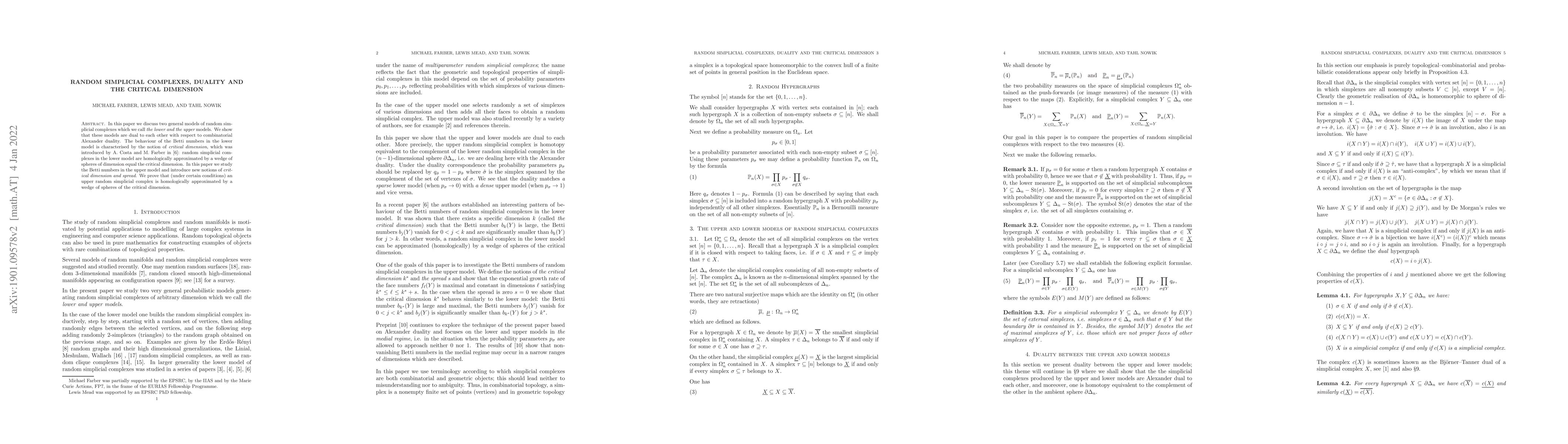 This paper presents two models of random simplicial complexes and demonstrates their duality via combinatorial Alexander duality. The lower model's Betti numbers are characterized by a critical dimension, while the upper model introduces new notions of critical dimension and spread, showing both models are homologically approximated by spheres at their respective critical dimensions.