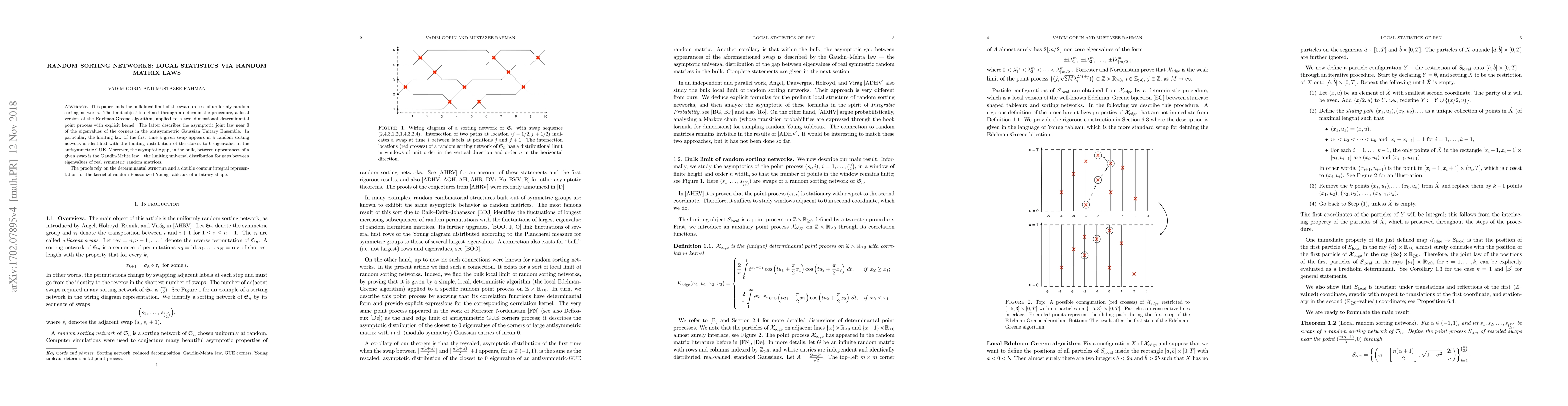 This paper finds that the time between swaps in a random sorting network follows the Gaudin-Mehta law, which describes gaps between eigenvalues of real symmetric random matrices, with the first swap's appearance related to the closest-to-zero eigenvalue of an antisymmetric Gaussian Unitary Ensemble.