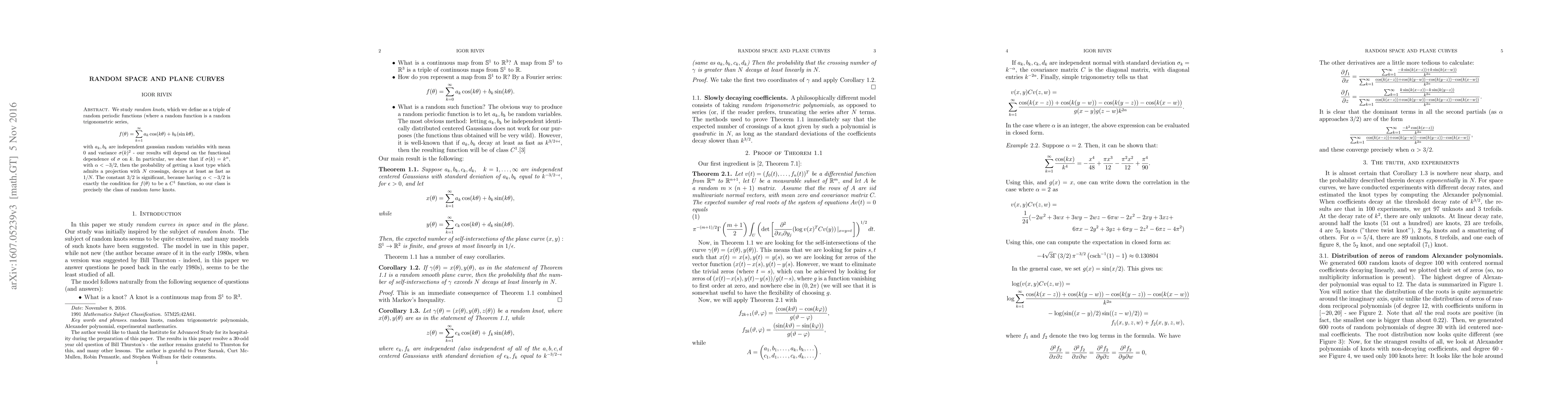 We study random knots, which we define as a triple of random periodic functions (where a random function is a random trigonometric series, \[f(\theta) = \sum_{k=1}^\infty a_k \cos (k \theta) +b_k (\sin k \theta),\] with $a_k, b_k$ are independent gaussian random variables with mean $0$ and variance $\sigma(k)^2$ - our results will depend on the functional dependence of $\sigma$ on $k.$ In particular, we show that if $\sigma(k) = k^\alpha,$ with $\alpha < -3/2,$ then the probability of getting a knot type which admits a projection with $N$ crossings, decays at least as fast as $1/N.$ The constant $3/2$ is significant, because having $\alpha < -3/2$ is exactly the condition for $f(\theta)$ to be a $C^1$ function, so our class is precisely the class of random \emph{tame} knots. We also find some suprising experimental observations on the zeros of Alexander polynomials of random knots (with slowly and non-decaying coefficients), and even more surprising observations on their coefficients. Our observations persist in other models of random knots, making it likely that the results are universal.