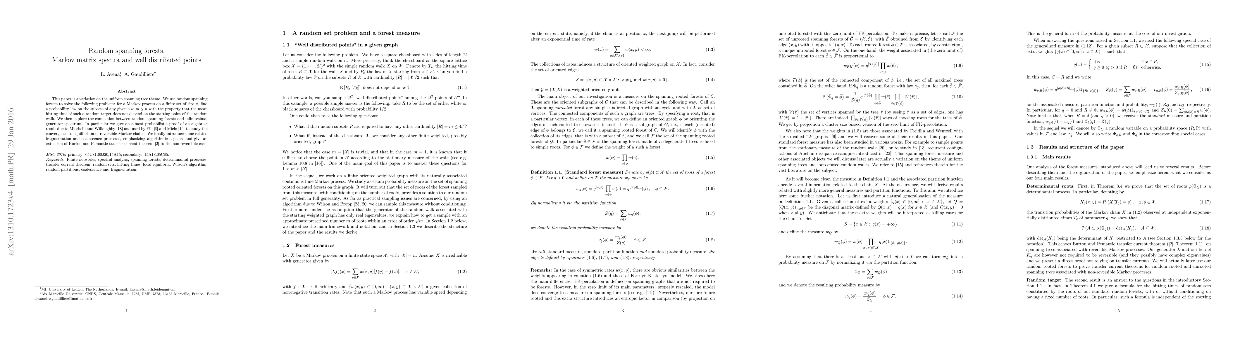 This paper investigates random spanning forests to determine a probability law for subsets in Markov processes ensuring uniform mean hitting times. It also explores connections between these forests and the spectra of infinitesimal generators, extending existing results and introducing related fragmentation and coalescence processes.