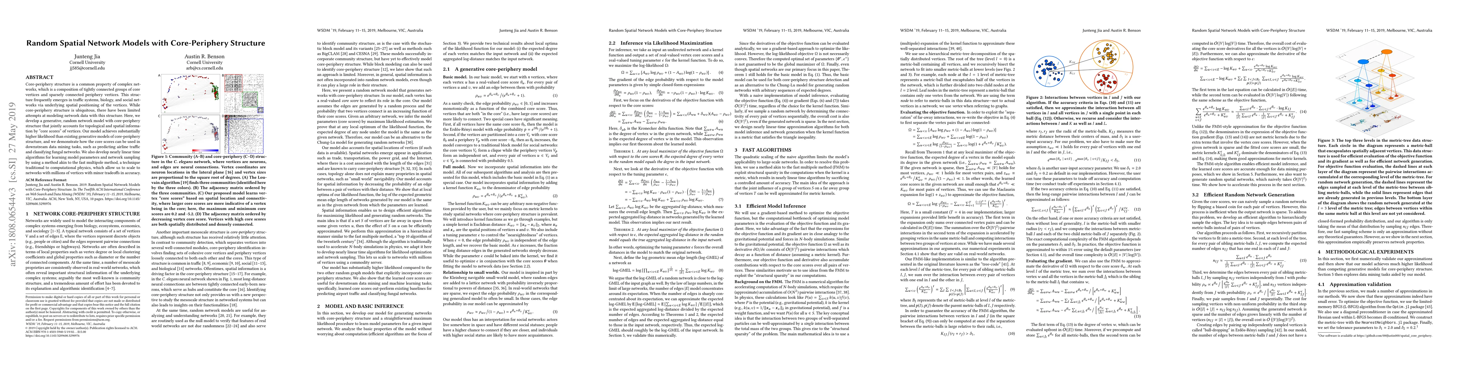 This paper introduces a generative random network model that captures core-periphery structures, integrating both topological and spatial information through vertex "core scores." The model outperforms existing methods and enables effective data mining applications, such as predicting airline traffic and classifying fungal networks, with scalable algorithms inspired by computational physics techniques.